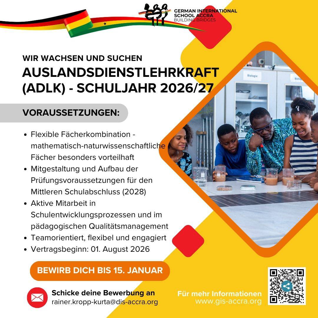 To support our continued development, we are looking for an Auslandsdienstlehrkraft (ADLK) with a flexible subject combination (especially welcome: Mathematics and the Sciences).