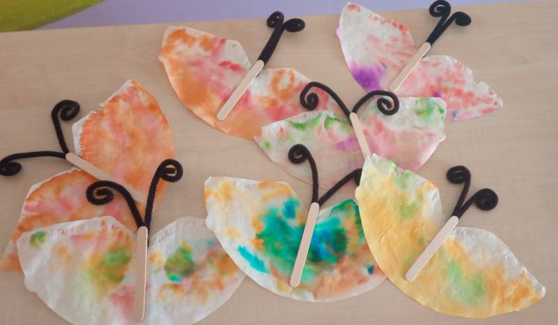 This week we started with the topic of colours and shapes in the nursery. The children had great fun making their own plasticine and then colouring it with food colouring. They were able to observe how colours change the material and creatively try out their own mixtures. Another highlight was making butterflies out of coffee filters. The children first painted them brightly and then watched in amazement as the colours mixed when water was added and new colour gradients were created. In the coming week, we would like to explore the topic of colours and shapes in more depth and offer the children further exciting opportunities to discover this world through play.