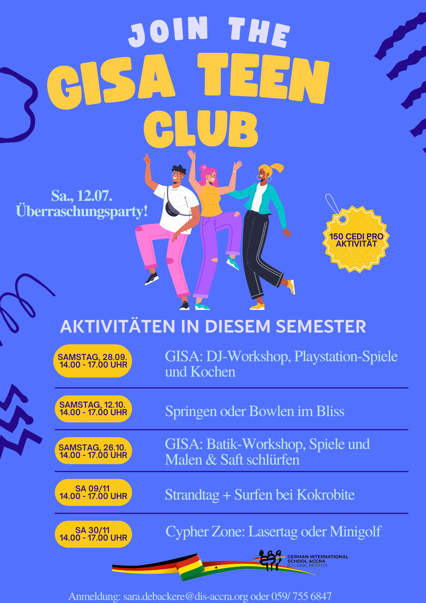 Exciting news! We are pleased to announce the launch of the GISA Teen Club, where teenagers can have fun, make friends and experience exciting activities together! Starting Saturday, September 28, from 2 to 5 pm, we will meet once or twice a month on Saturday afternoons to experience activities such as bowling, laser tag, surfing, DJ sessions, crafts and much more. It's going to be great fun! Children from outside the school are also welcome, as long as they are between 10 and 14 years old. You can find more information about participation and activities in the coming months in our flyer.