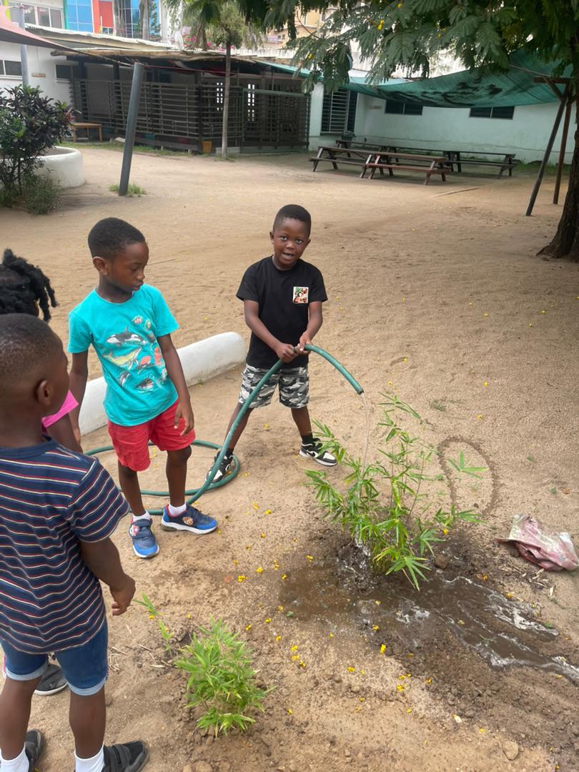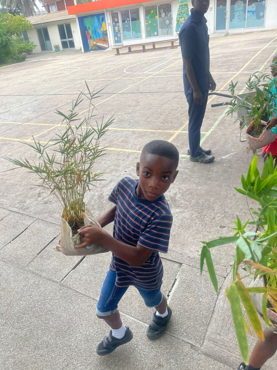 Shortly before the Christmas holidays, parents, students and staff came together for a hands-on sustainability project. Initiated by parents, pedagogically guided by Ve Fredrich and Russell Adu, and supported by our gardeners Dominic Adamu and Isaac Ayamga, 40 bamboo plants were planted along the inside of the school wall.