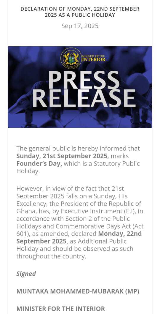 On Monday, September 22, 2025, the school will remain closed in observance of Kwame Nkrumah Memorial Day (Founder's Day), as confirmed by an official press release from the Ghanaian Ministry of the Interior.