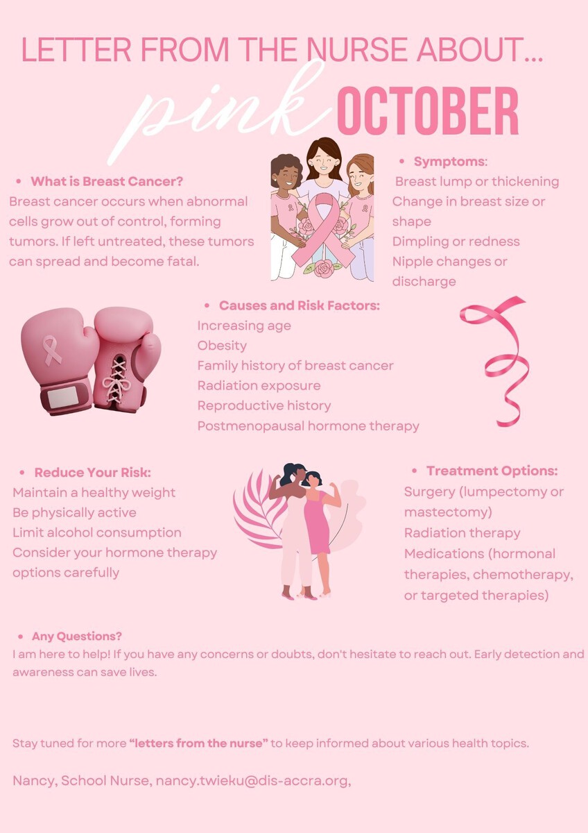At GISA, we are also joining the global effort to raise awareness. Our school nurse, Nancy Twieku, uses this month to educate our community about breast cancer, its risk factors, warning signs, and the importance of early detection.