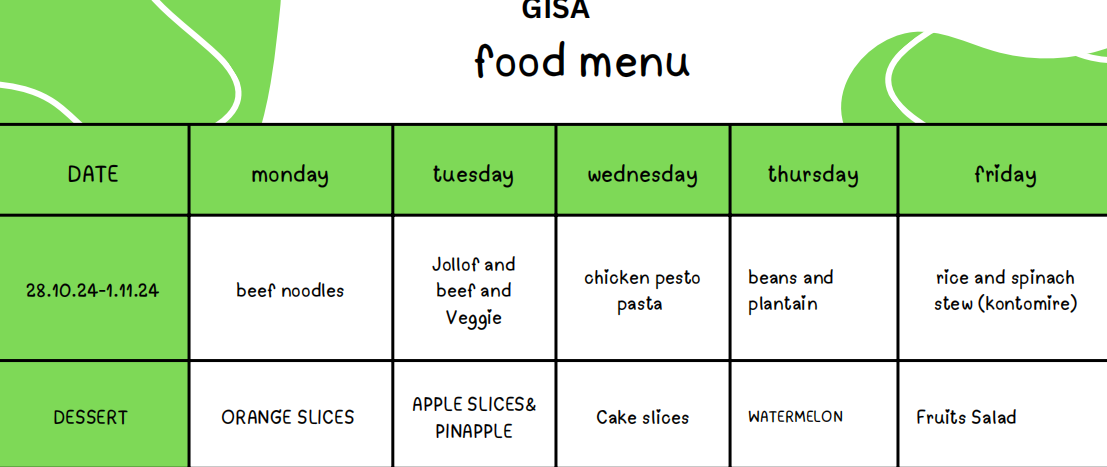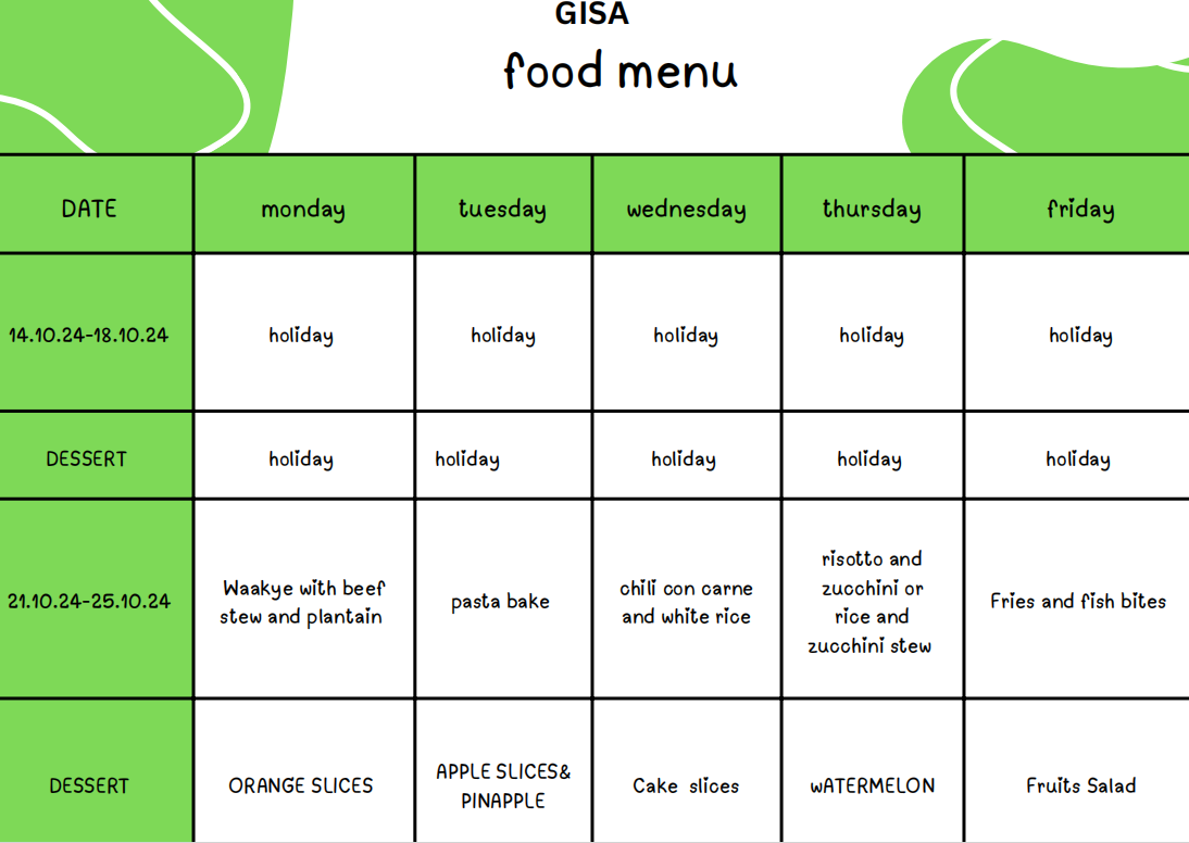 North Ridge Café is excited to introduce its new menu for the month of October. As a special offer, if you pay for your child’s meals for the full month, your name will be entered into a draw and you’ll be assigned a number. You could win one of several vouchers (₵150, ₵100, or ₵50), that can be spent at North Ridge Cafe. As usual you can find the prices per child, the MoMo account and menu on the website. If you have any questions, don’t hesitate to reach out.