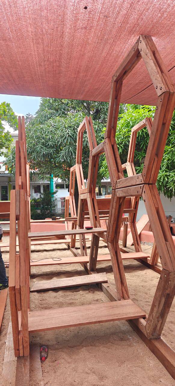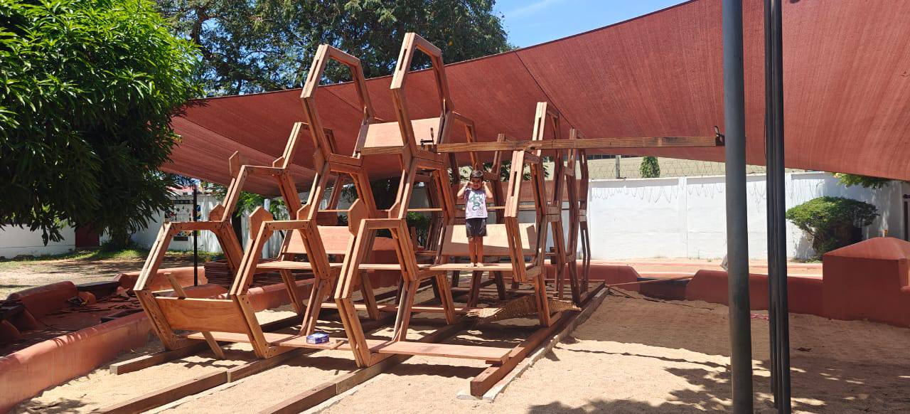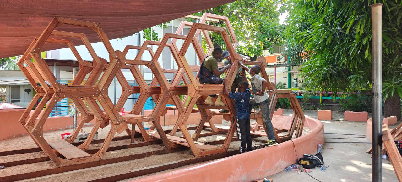 The innovative structure, inspired by the shape of honeycombs, is already clearly visible. Much like a buzzing beehive, this unique space is designed for our children to explore, bring to life, and fill with imagination and play.