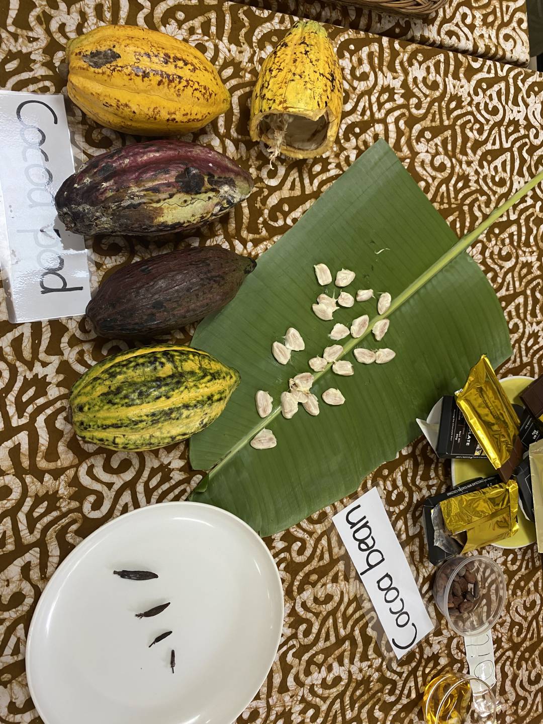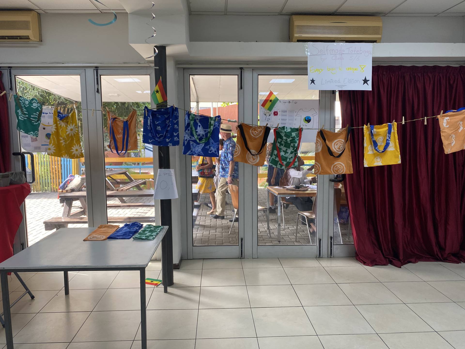 The following days we were visited by several interesting partners: The Cocoa Institute who informed the kindergarten and class 1/2 about the history and development of the cocoa bean. The company `57 Chocolate` came by for a chocolate tasting and helped us make our own chocolate. Class 3/4 had a workshop on shea butter and made their own personal shea butter. Class 5/6 had a visit from Joyce of Friskyness, who is also a former student of our school. They focused on creating their own foam design and printed them on a thrifted cloth. The rest of the week they worked hard to make their own tote bags to sell at the market.