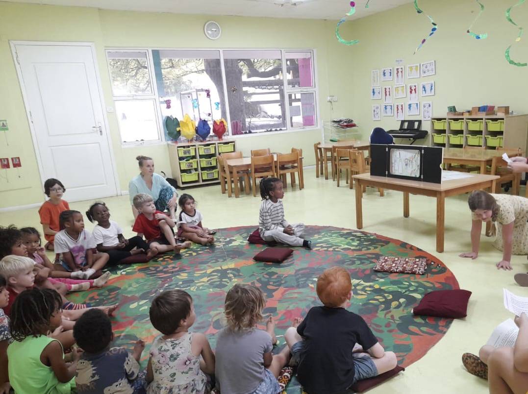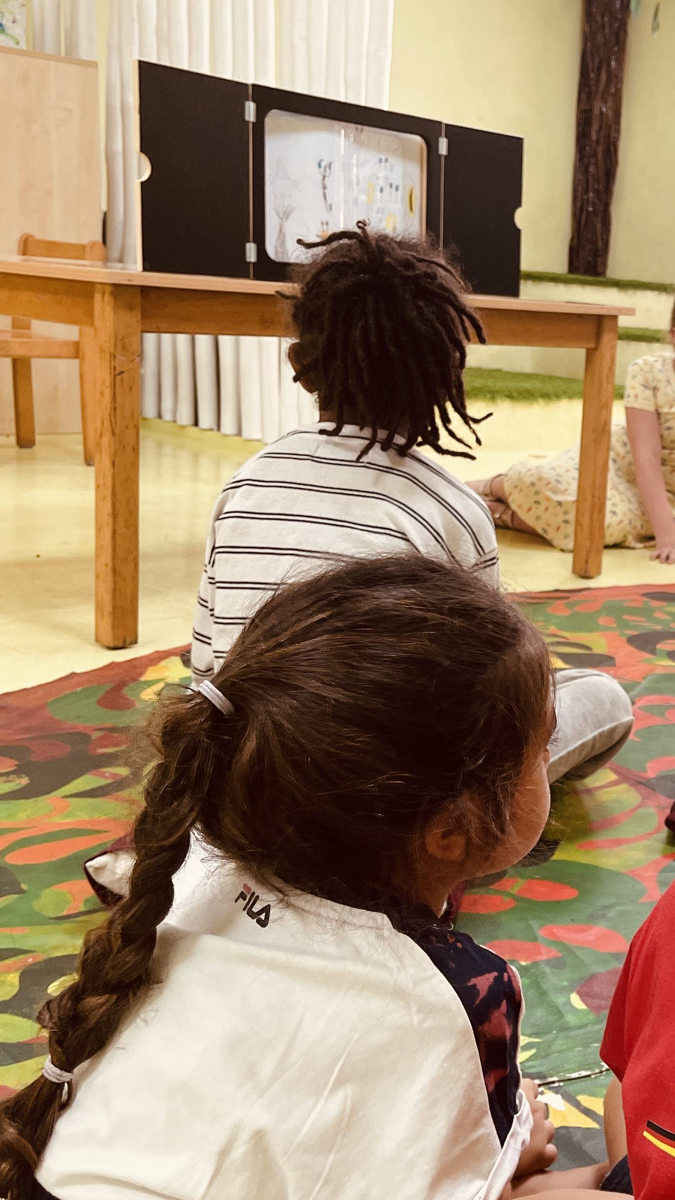 The children from Class 3/4 surprised the kindergarteners with a self-written story, while the DaF students from Classes 5/6 enchanted the children in Grades 1/2 with the book “A Little Piece of Happiness.”