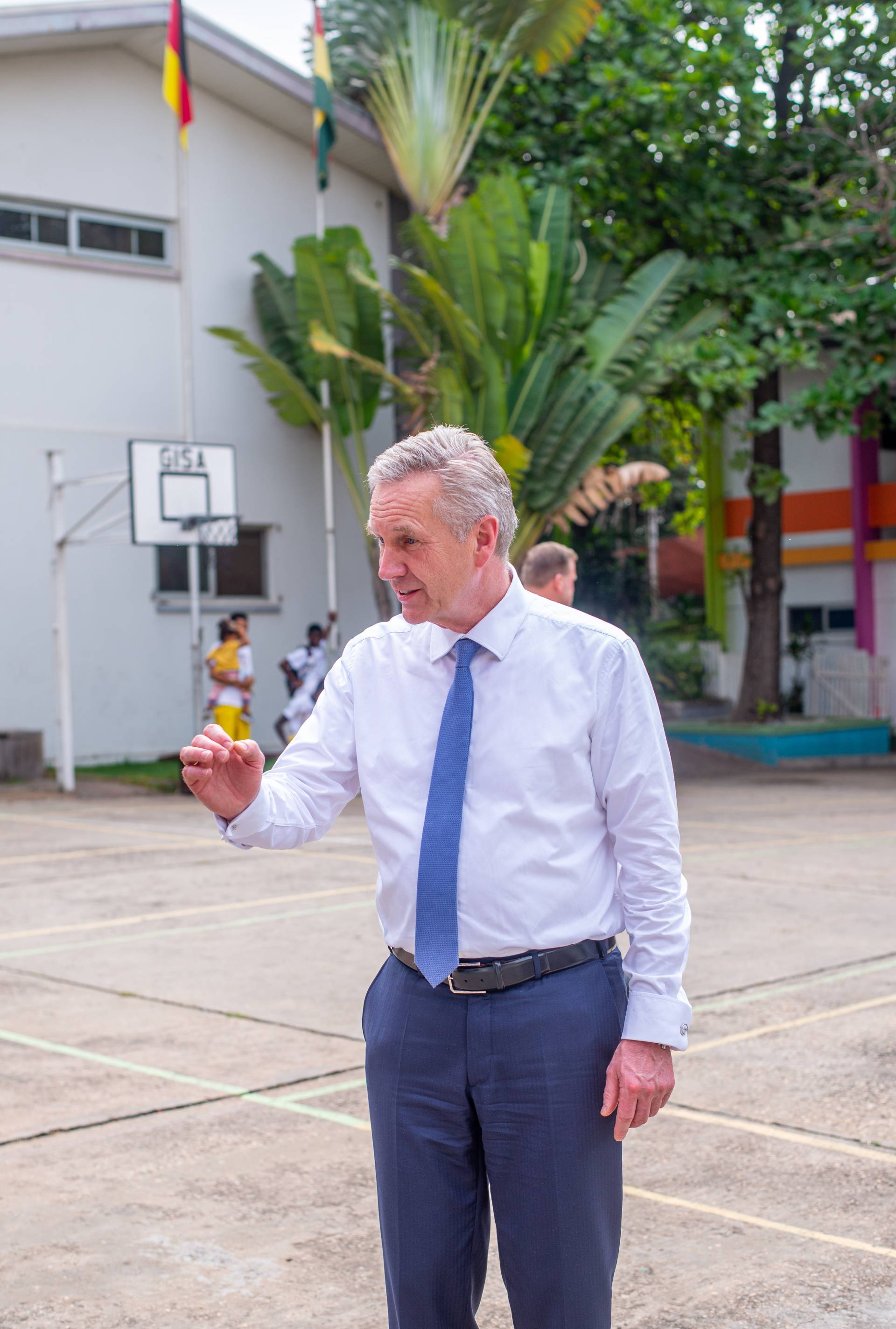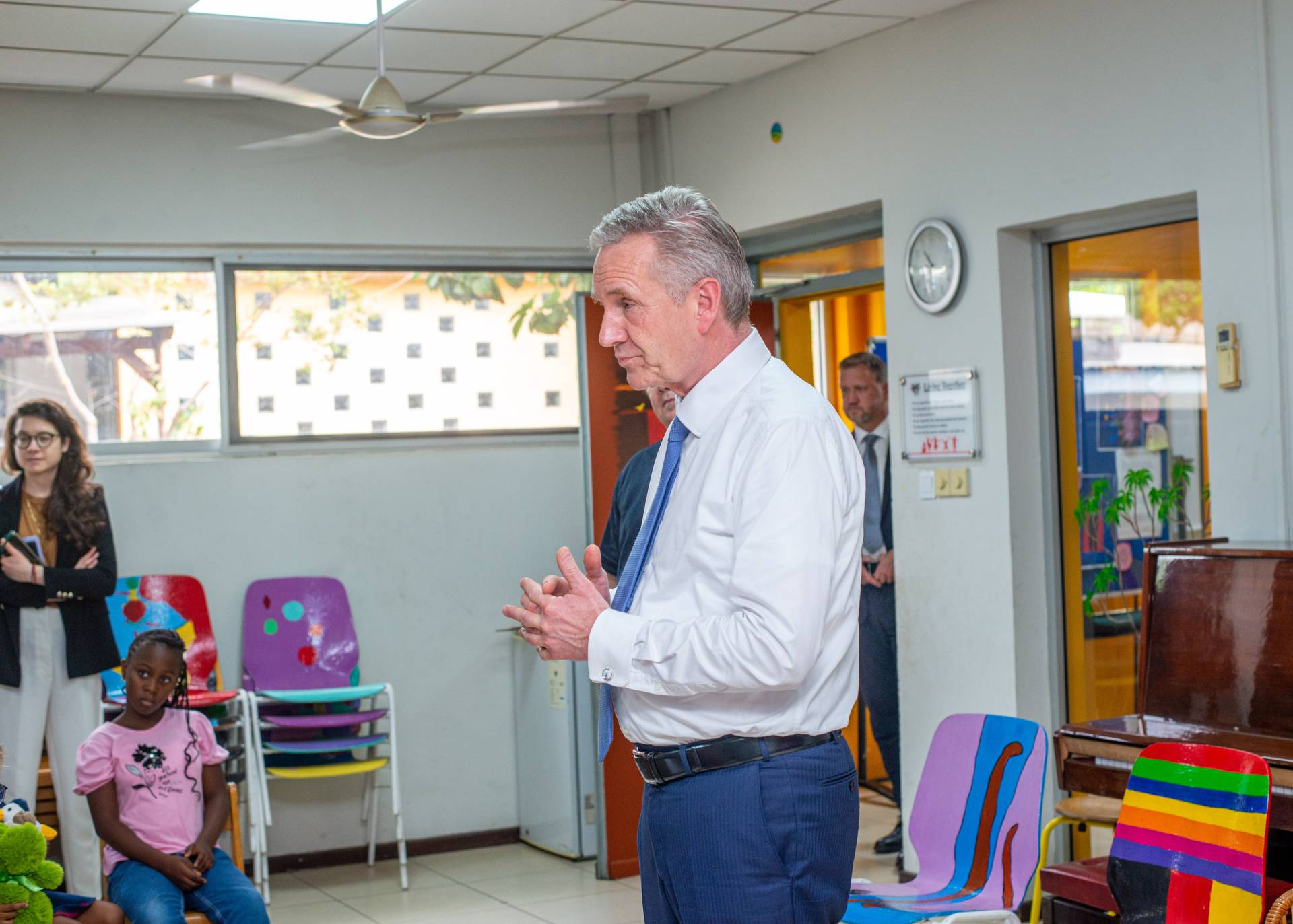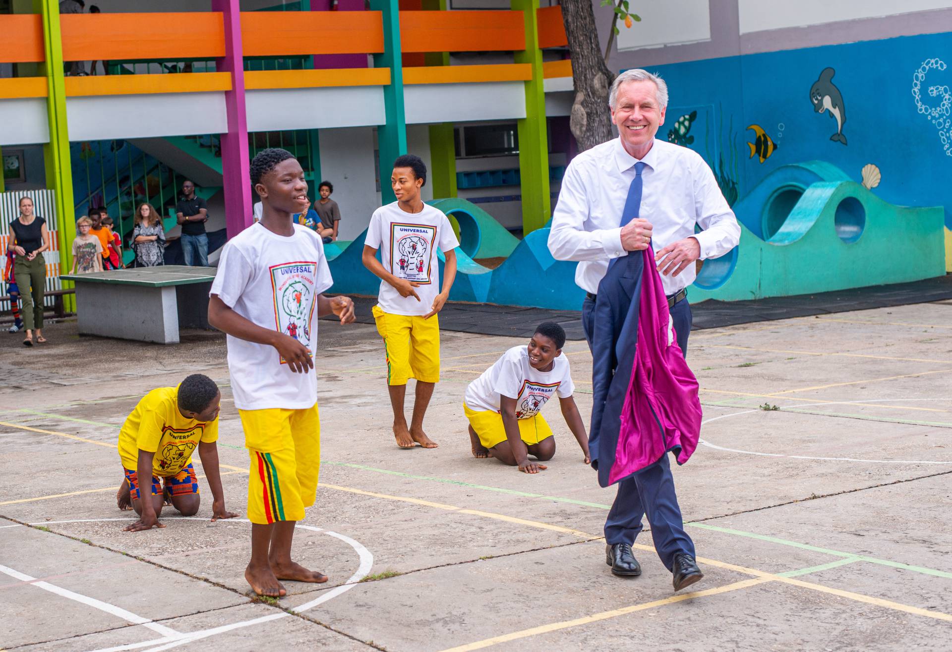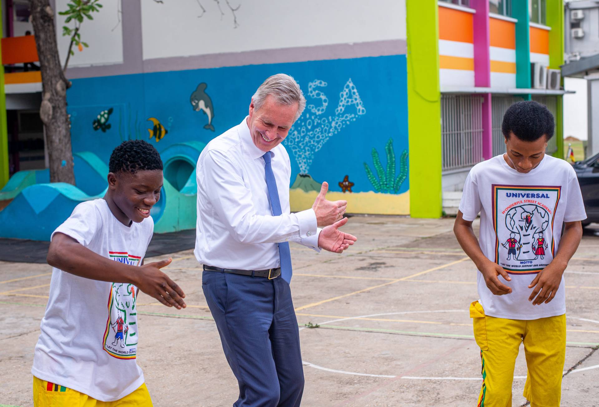 Wulff was welcomed by the artists of the Universal Wonderful Street Academy and was even persuaded to dance. In a round of talks with representatives of the school board, parents and embassy representatives, staff and the school management, the remarkable development of the school and the challenges ahead were discussed. Headmaster Rainer Kropp-Kurta was able to report on the significant increase in pupil numbers and the cooperation with NGOs, universities and educational institutions and the function of building bridges. Christian Wulff proved to be an attentive listener, and not just when it came to the situation regarding promotion as a German school abroad. He also gave interesting insights into his still very active fields of activity βoff dutyβ.