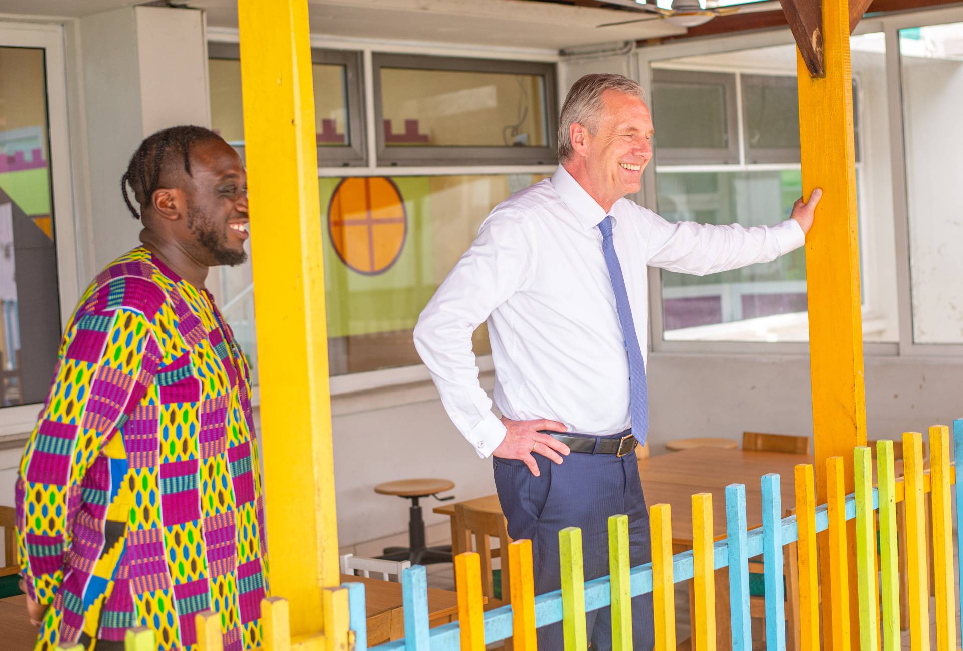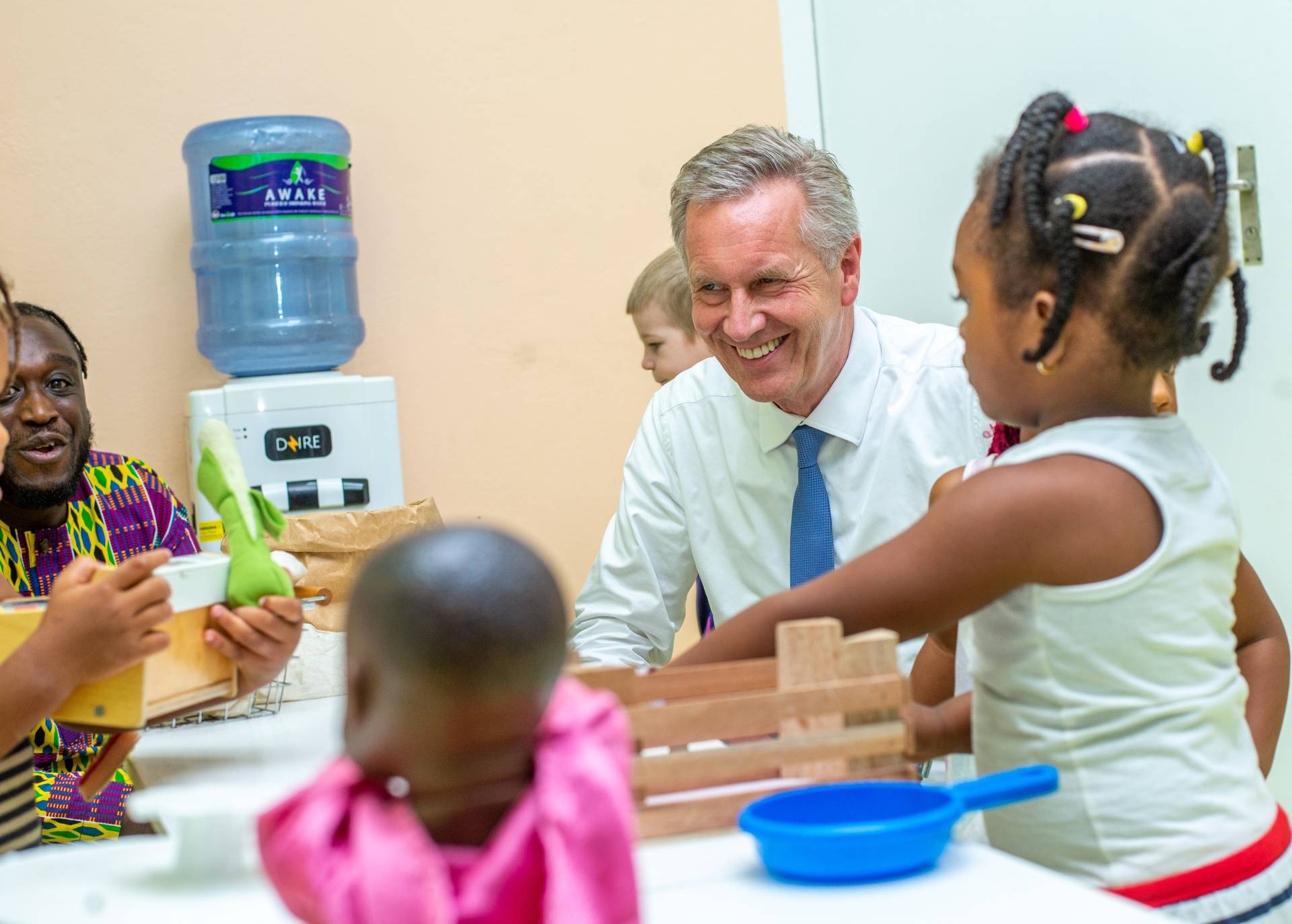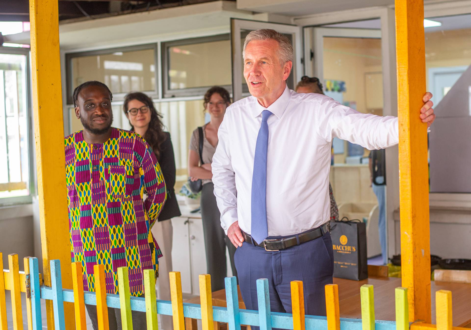 After a visit to the newly renovated daycare centre and further discussions with teachers and head of kindergarten Evans Rudi Boakye, the politician answered questions from the group of students in grades 1 to 7. The children and young people really quizzed Wulff: from the challenges of his time in office to his hobbies and favourite foods, they were eager to find out more. The former Federal President patiently answered all the questions and wanted to know a few things from the pupils. Christian Wulff summed up his visit to a school βthat you like to go toβ very positively.
