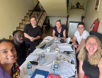 The extended school management team, all-day coordinator Sara Debackere, head of kindergarten Rudi Boakye, deputy Deike Akorful and headmaster Rainer Kropp-Kurta, joined by PQM representative Ramona Klaes and German as a foreign language teacher Ben…