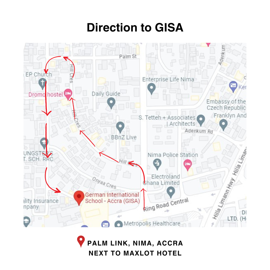 Travelling by Trotro / Public Transport: Alight at "Nima (Police) Station" and walk, about 3-5 minutes to us at the school. You can either walk past the Presidentβs House or access us through the "entrance" of the Star FM building.