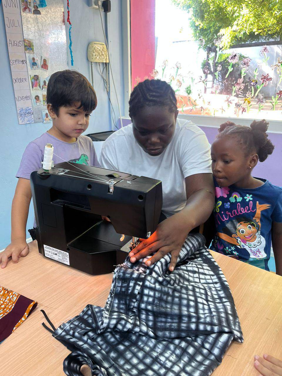 Next, it was time to get hands-on: at the sewing machine, colorful fabrics and recycled materials were turned into real fashion pieces. With great excitement and teamwork, the children brought their designs to life β and the results were truly impressive!