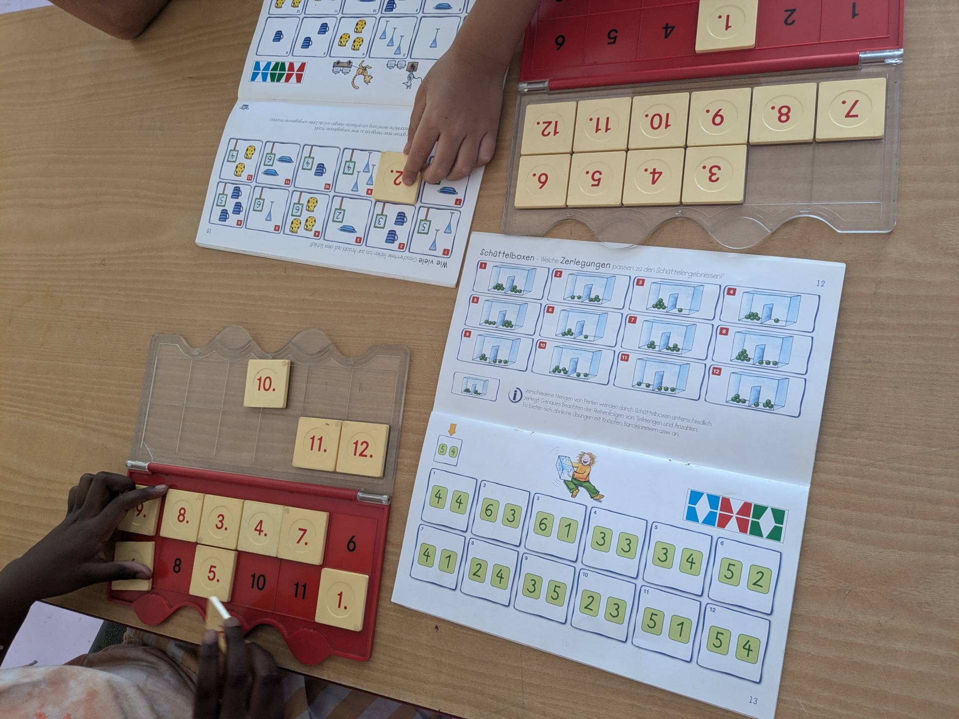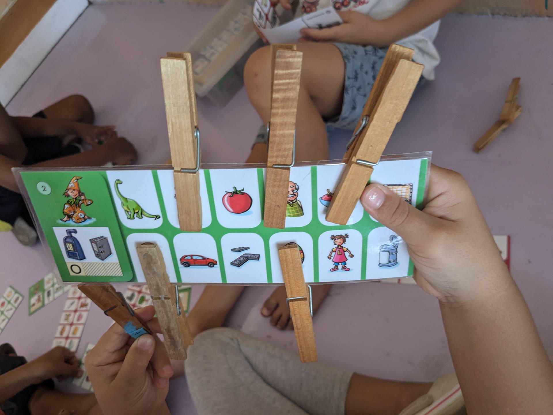In preschool, we use various tools to reinforce what has been learned. Which sounds do you hear at the beginning of a word? Attach a clothespin. Count things and find the matching number, then place the correct tile. We also work with the Anton app, which the kids always enjoy.