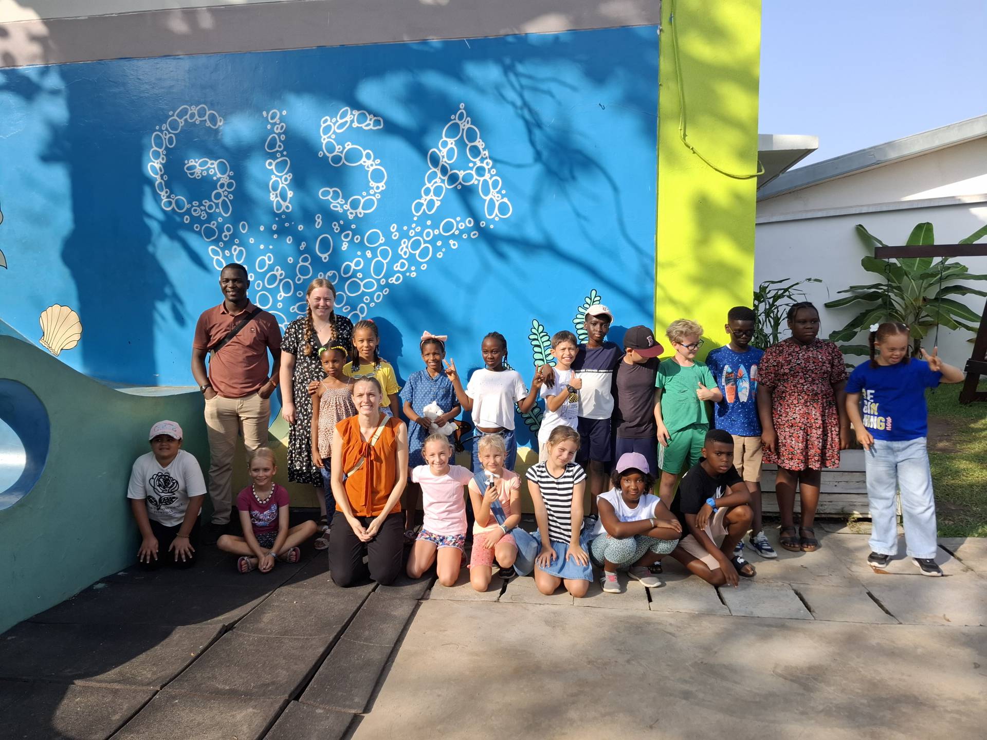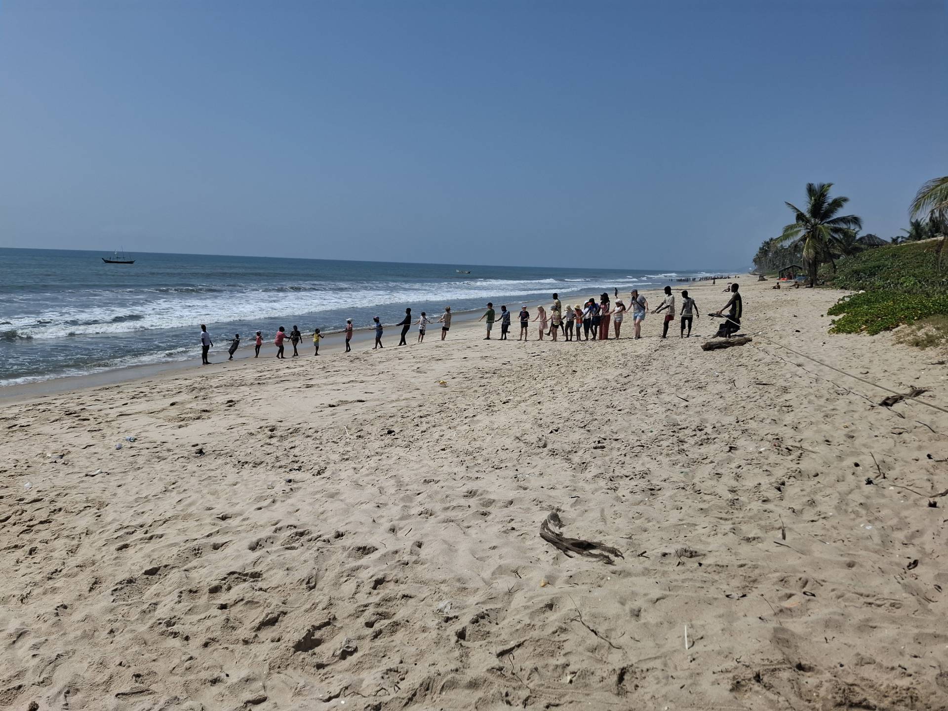 The next morning started early. At around six o'clock, the first children started their own morning sports around our houses and everyone was wide awake. We still had time to play and chat because breakfast wasn't until eight o'clock. We had pancakes, eggs, bread, fruit, Milo, tea and water for breakfast. So we could all start the day energised. After breakfast, we went to the beach again to see where the fishing boats are made. Unfortunately, no work was being done there. So we took a class photo and went back. Once we arrived at the Sunflower Beach Resort, we put our feet in the sea again and helped a group of children bring their fishing net ashore. That was quite exhausting. Afterwards we had time to relax a bit - some children played games or chatted in their rooms. Some children made bracelets or party decorations for the evening.
