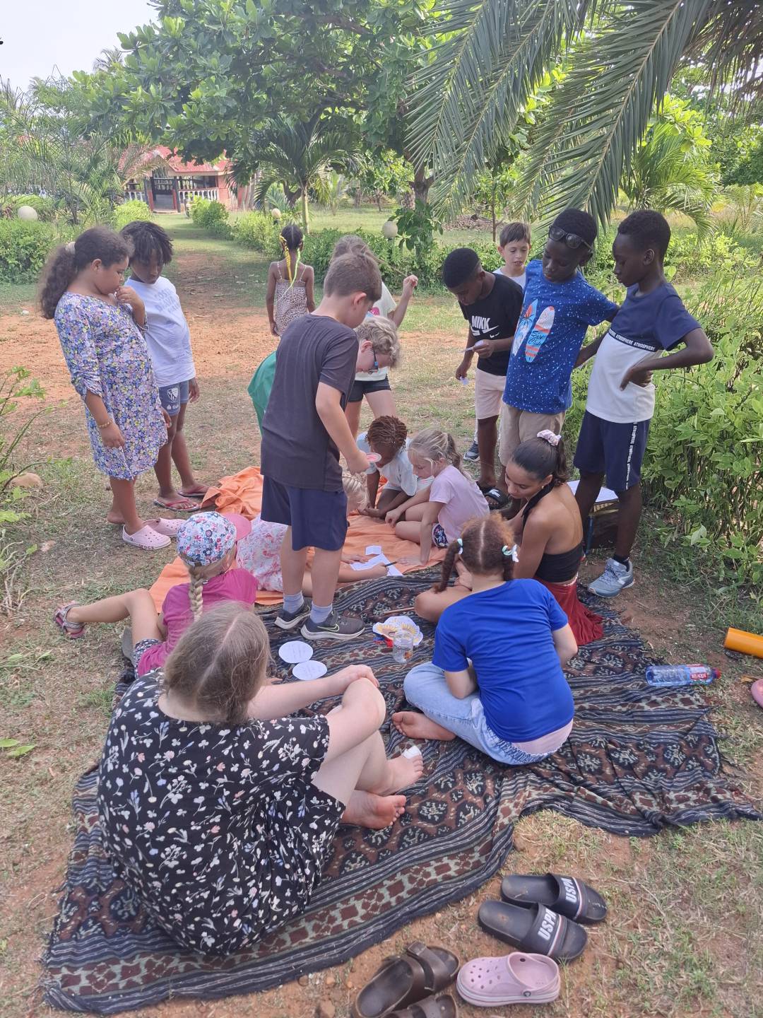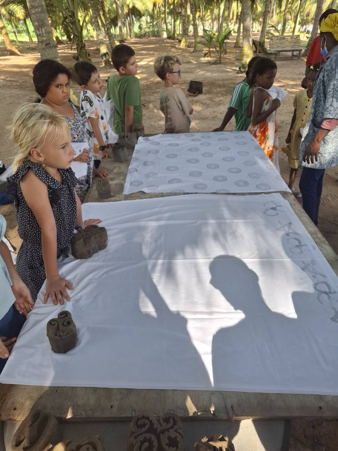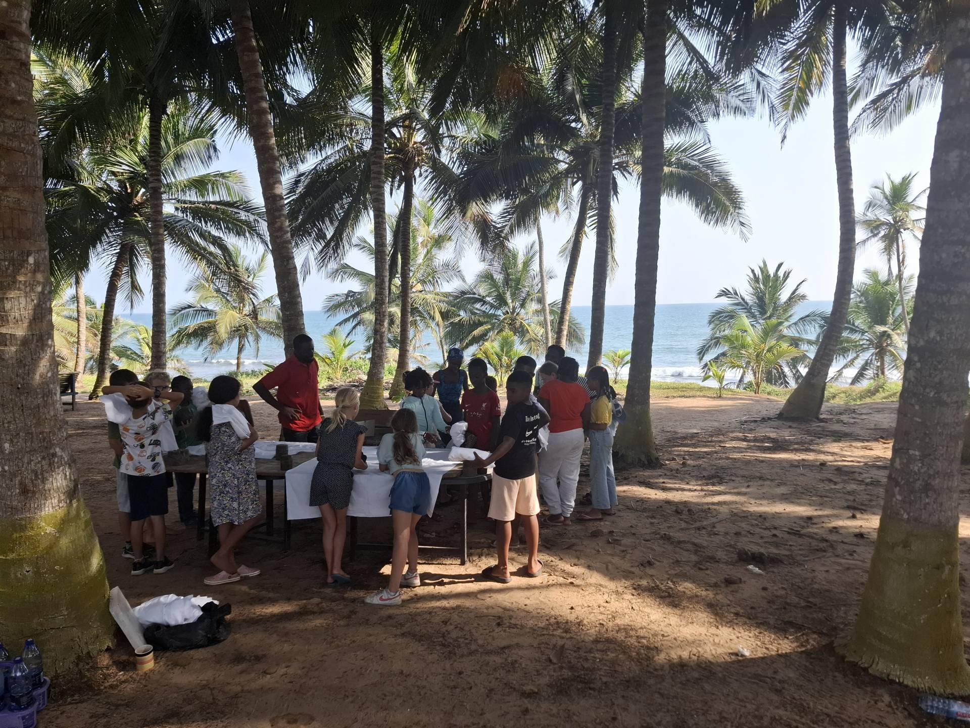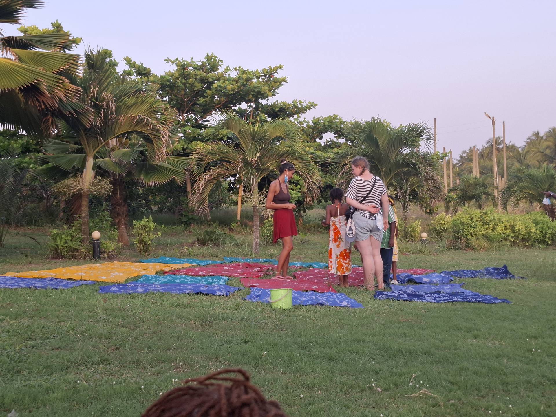 Then we had lunch - burgers with chips. After lunch, we did a batik workshop under palm trees. First we chose a stamp and then we used it to make wax on white fabric. Everyone could personalise their fabric. Then we decided on a colour and dyed the fabric. Finally, it was washed and dried in the meadow. Unfortunately, it wasn't completely dry by the evening. After we had presented our fabrics to our classmates, we had dinner: Jollof, fried rice with chicken, fish or sausages.