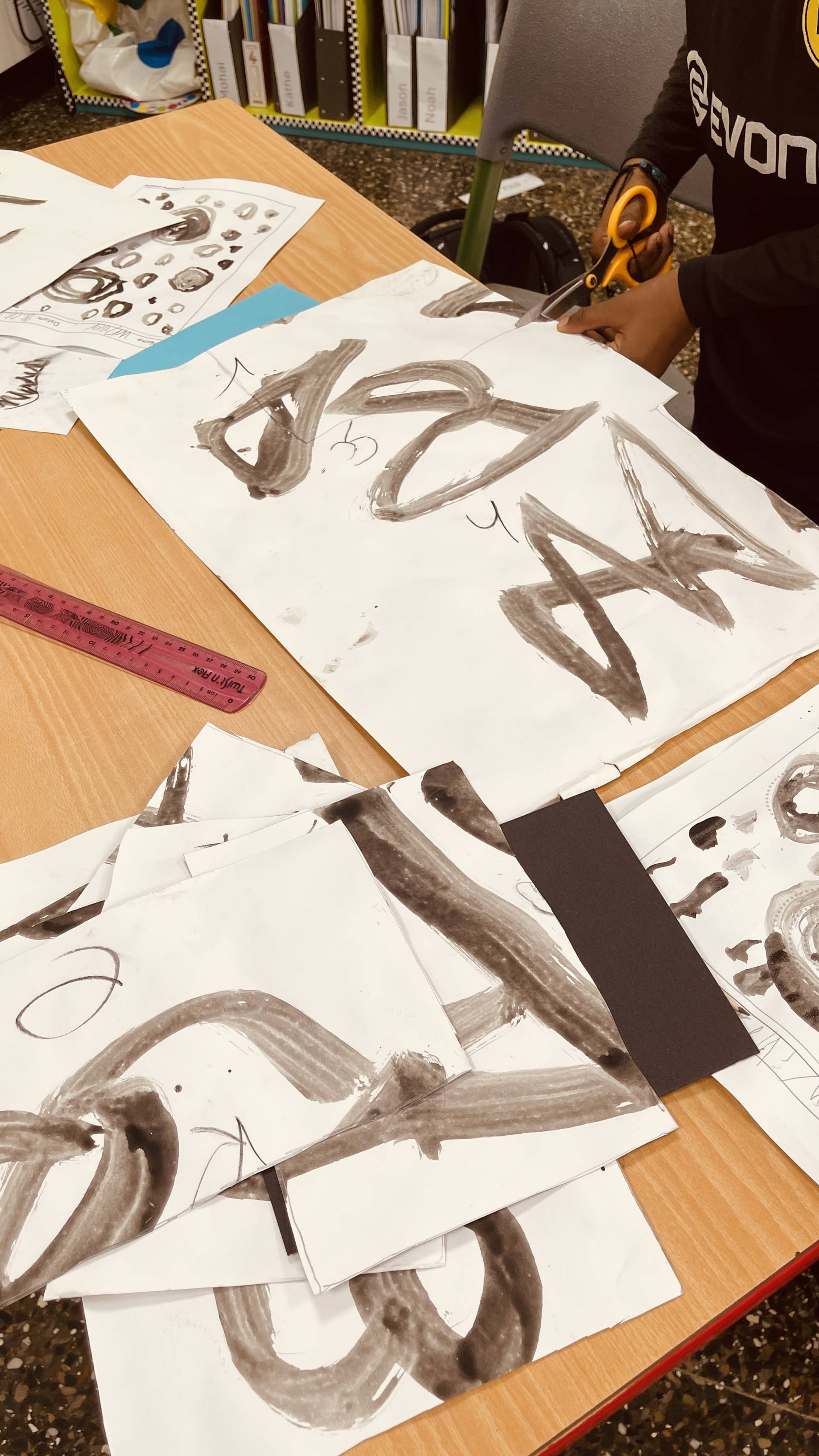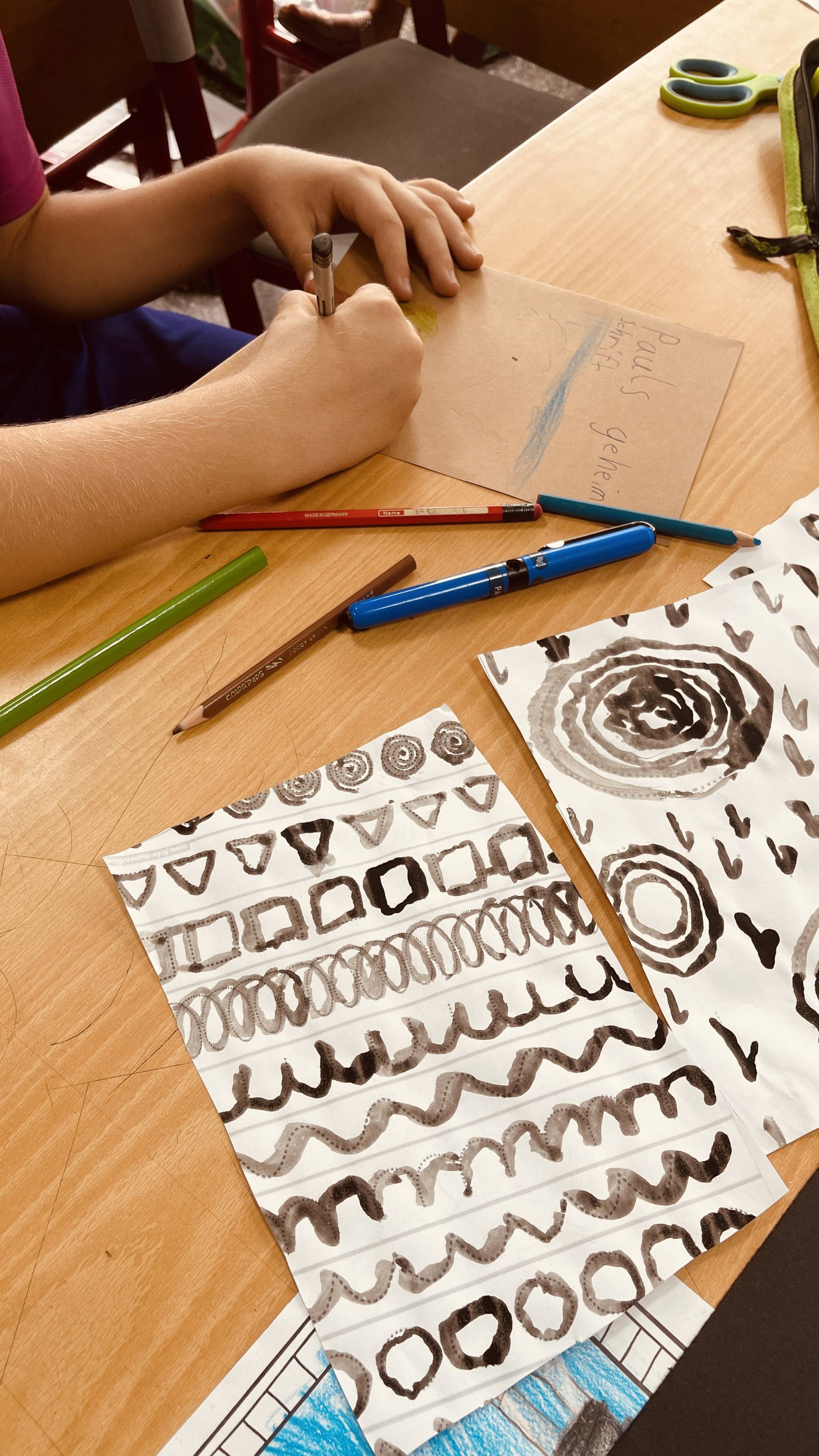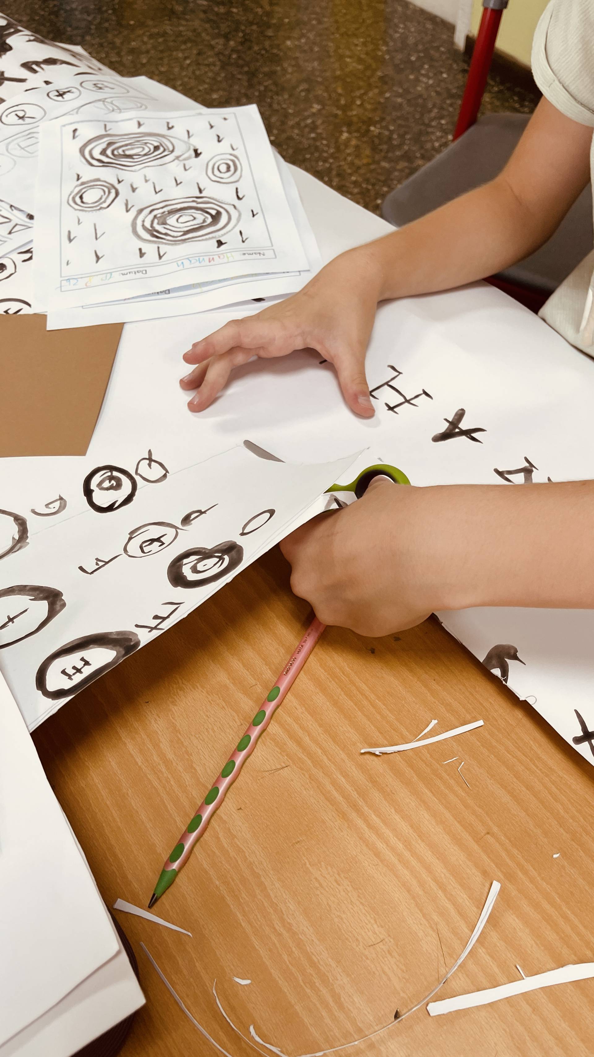 This week, the students of the support group „Stärken stärken“ wrapped up their journey into the world of fonts with a special project: creating their very own mini-book. They cut out the pages from their previously designed character sheets, bound them together, and decorated them with a handmade book cover. The result is a collection of unique little books that already spark curiosity on the outside – and hide plenty of mysterious signs and ideas inside.