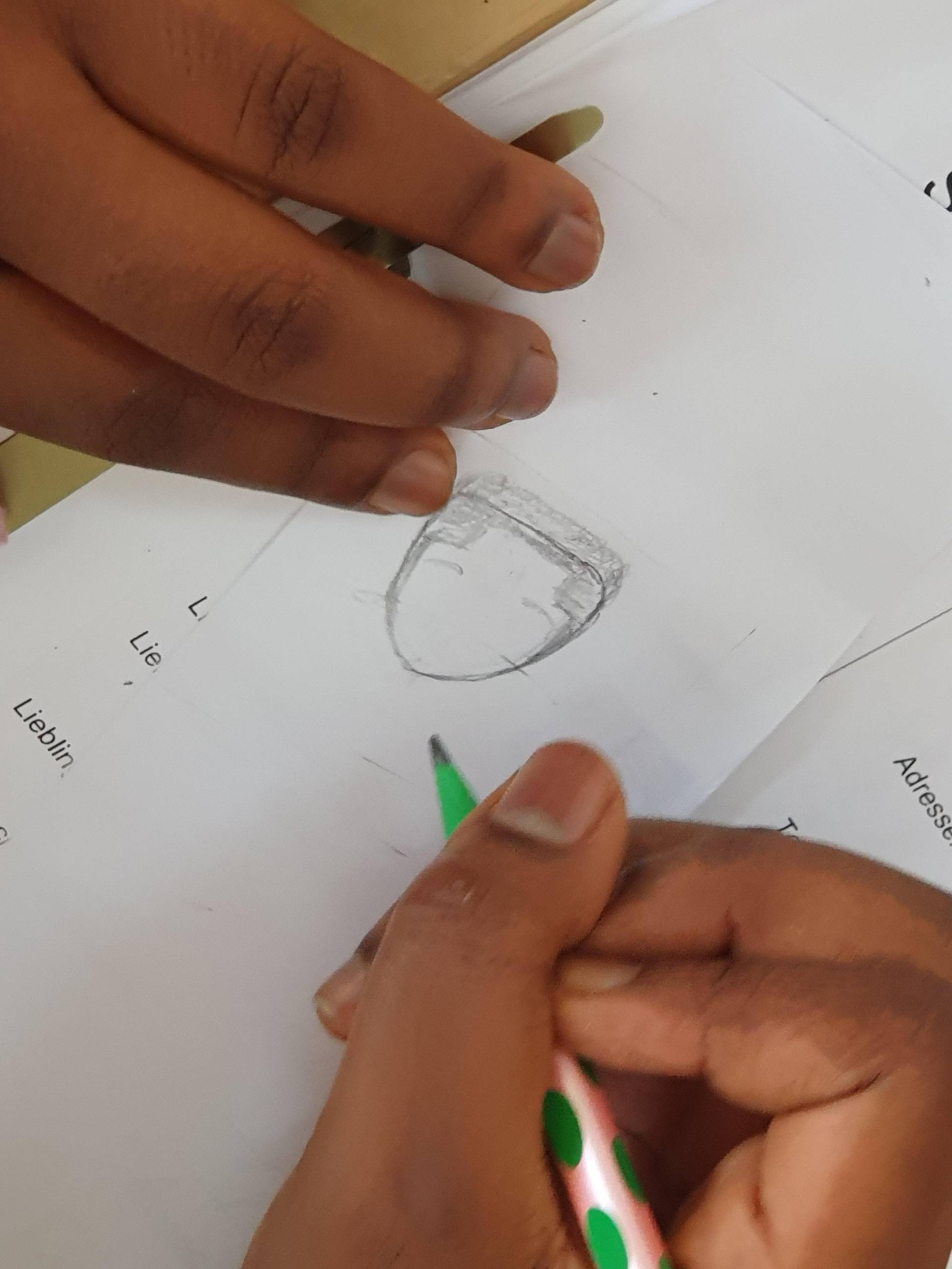 The DaF class at secondary level (the motivated pupils in years 5, 6 and 7) got to grips with the German tradition of school cones before the vacations. They each made one as a welcome gift for the new students starting in May. The results were varied and colorful.This week, our topic was the vocabulary of the circle of friends, school, lessons, but also nutrition and the food pyramid.With the topic of school and lessons, the learners have dealt with the polite form, negation and possessive articles in grammar.This Friday, the DaF group once again wrote a learning objectives test on this week's topics.What the learners also prepared this week were profiles for future collaboration with students from the University of Potsdam. Next week, the students will receive letters of introduction from Potsdam and prepare for their future interview acquaintances.