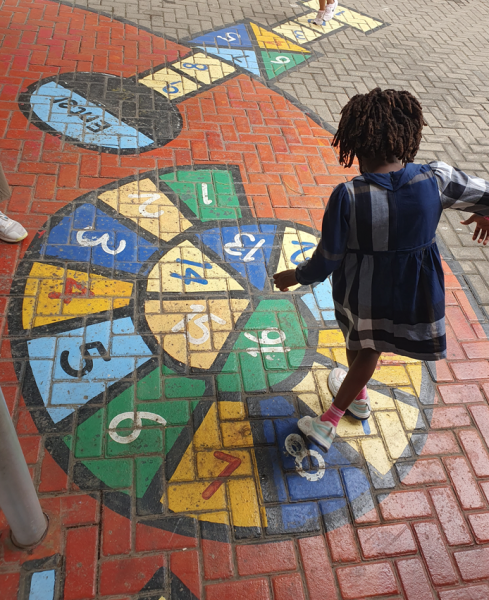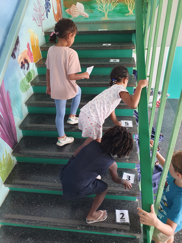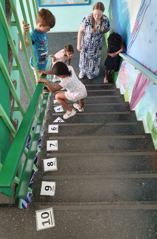 Den Zahlenraum von 1 bis 10 begehen, ersteigen, durchhüpfen und erleben. Dabei auch die Zuordnung von Menge und Ziffer festigen, das sind die Ziele in diesem Förderband von Benjamin Akrong.
