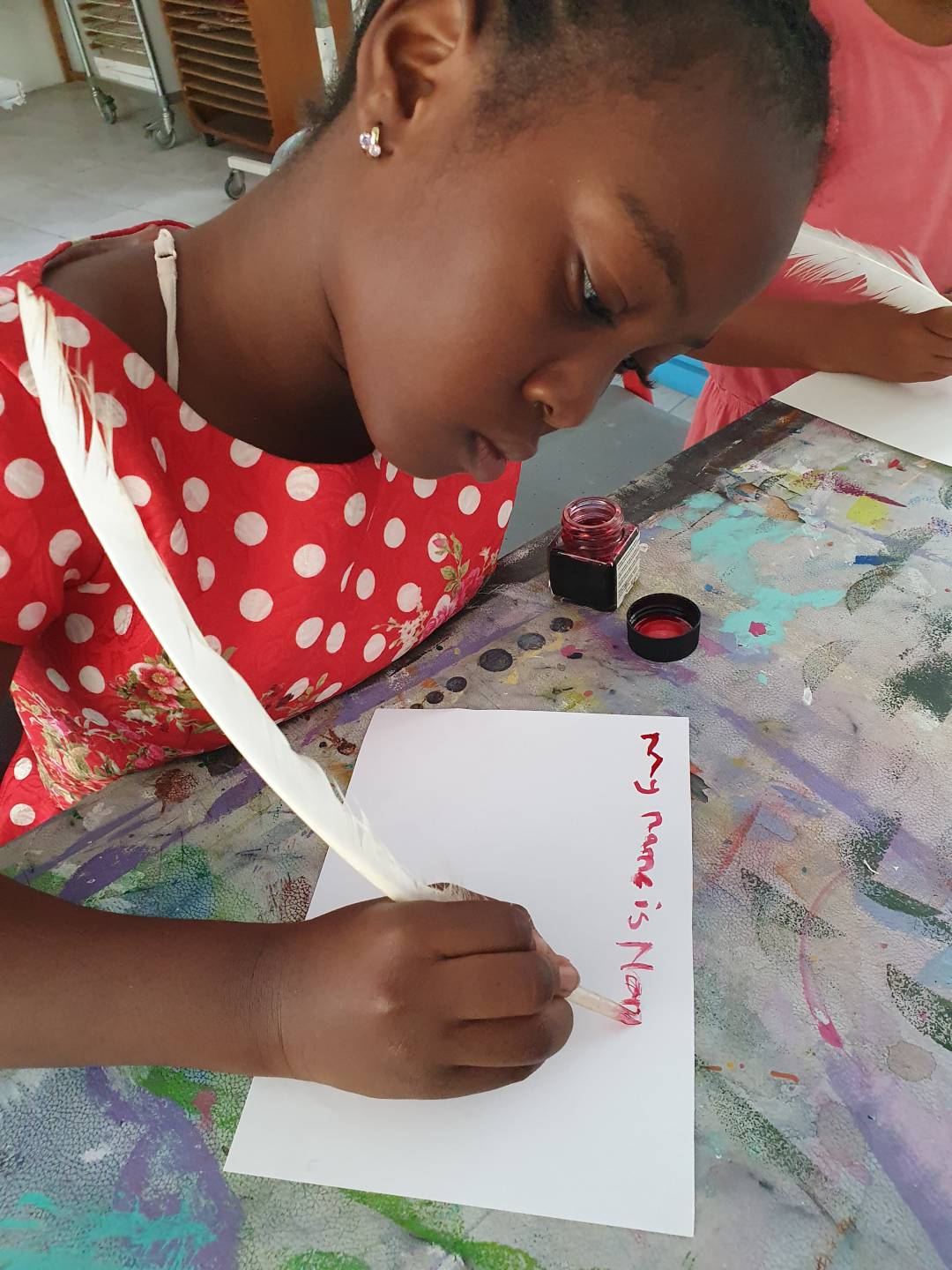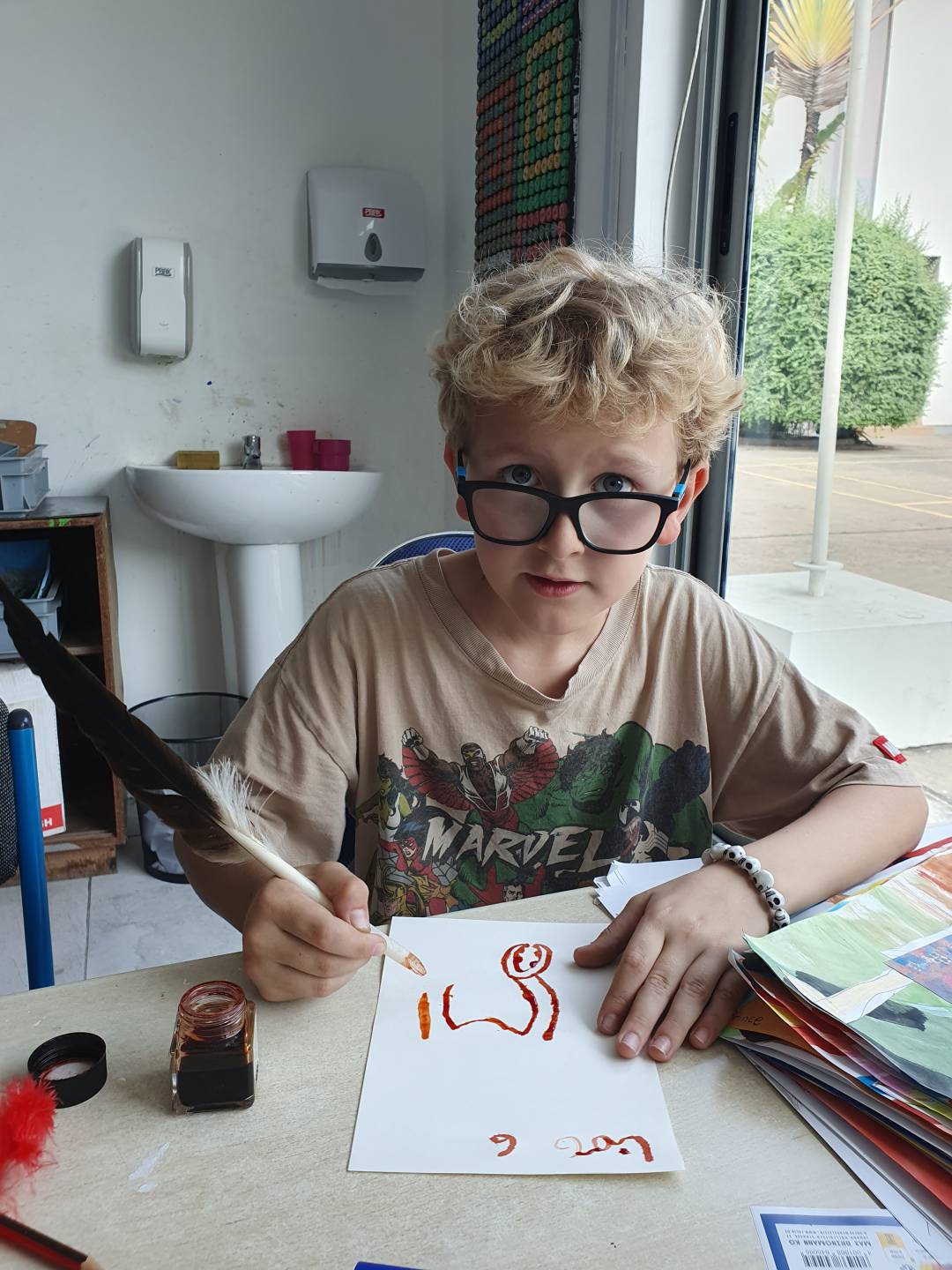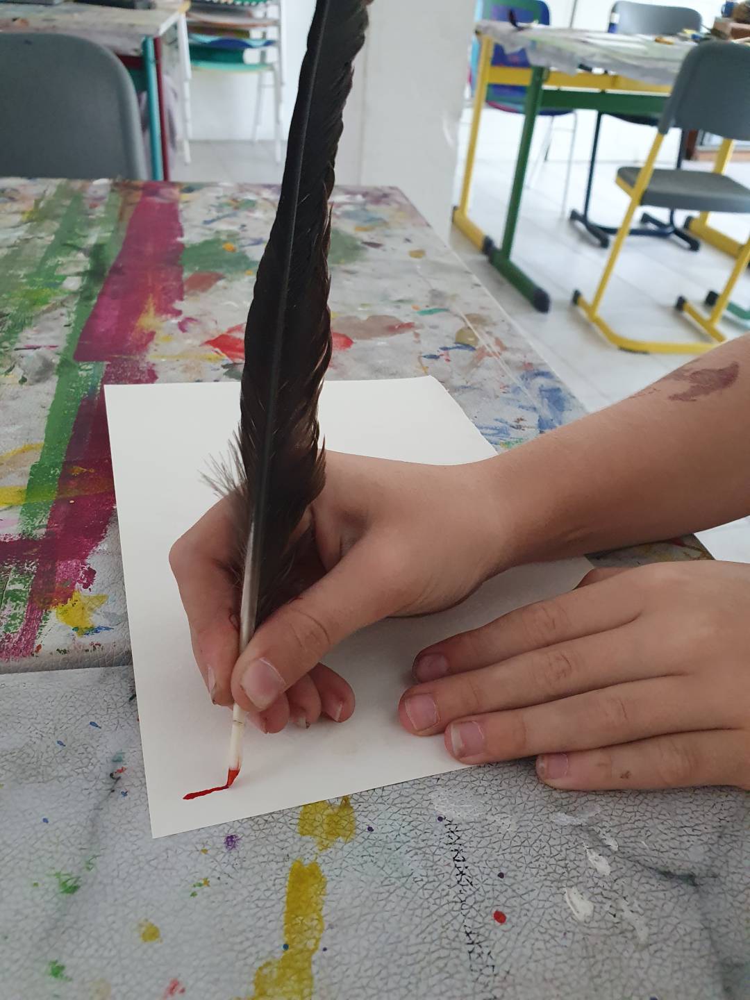Ein schönes Beispiel der neuen Projektzeit: Nach der anspruchsvollen Vorbereitung der Pflanzenteile und dem Weben des Rohmaterials freuten sich die Schülerinnen und Schüler, ihre gut gepressten Papyri aufzuschlagen. Im nächsten Schritt präparierten die Kinder ihre Federn von Tauchervögeln und lernten sofort, damit zu schreiben und zu zeichnen.