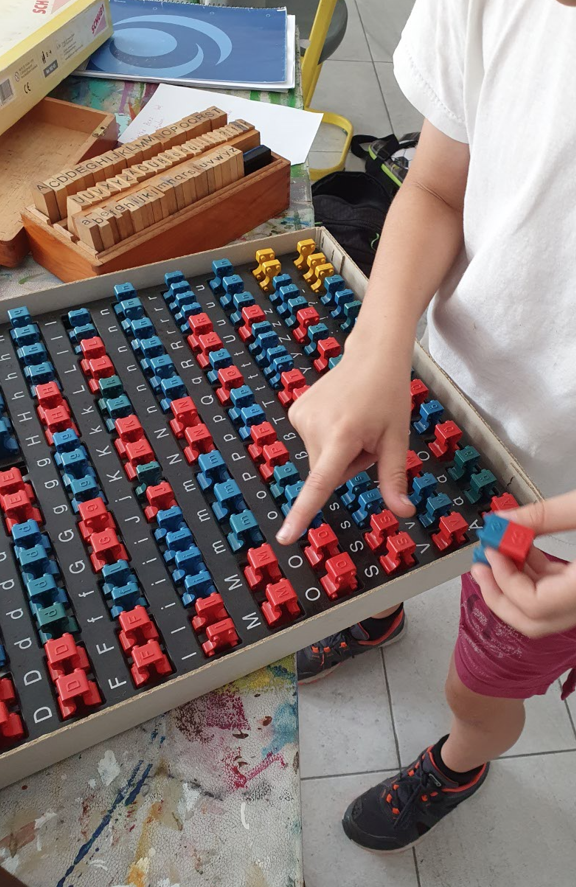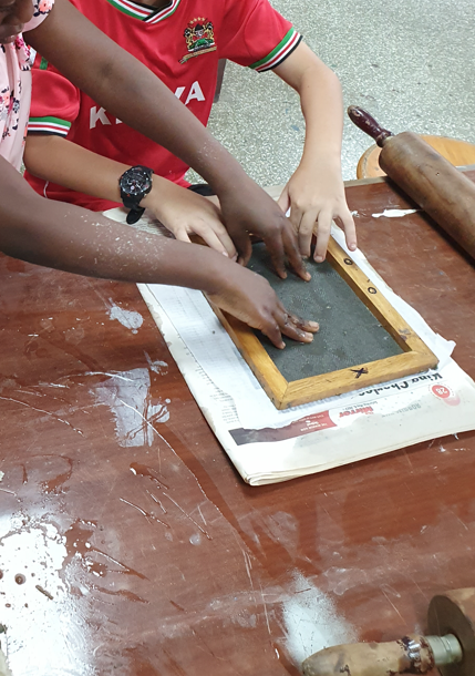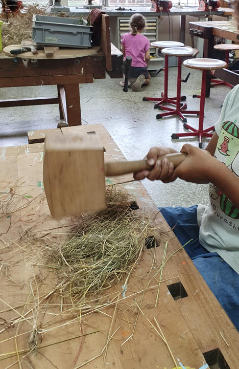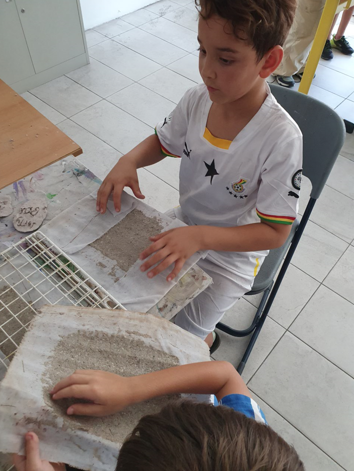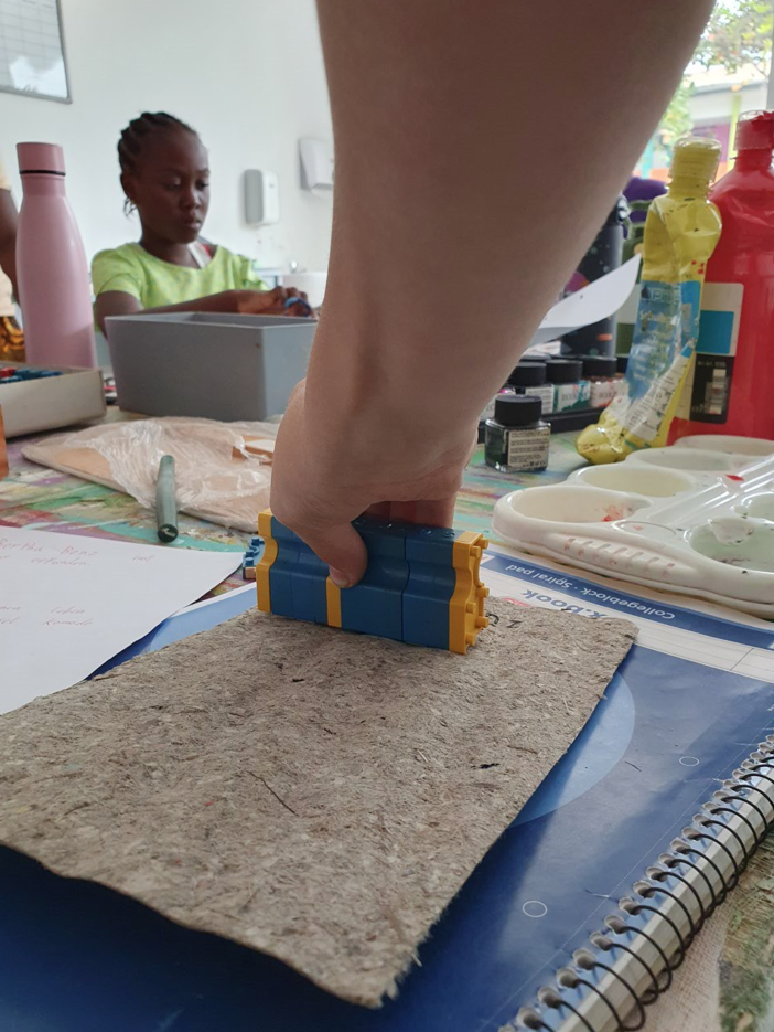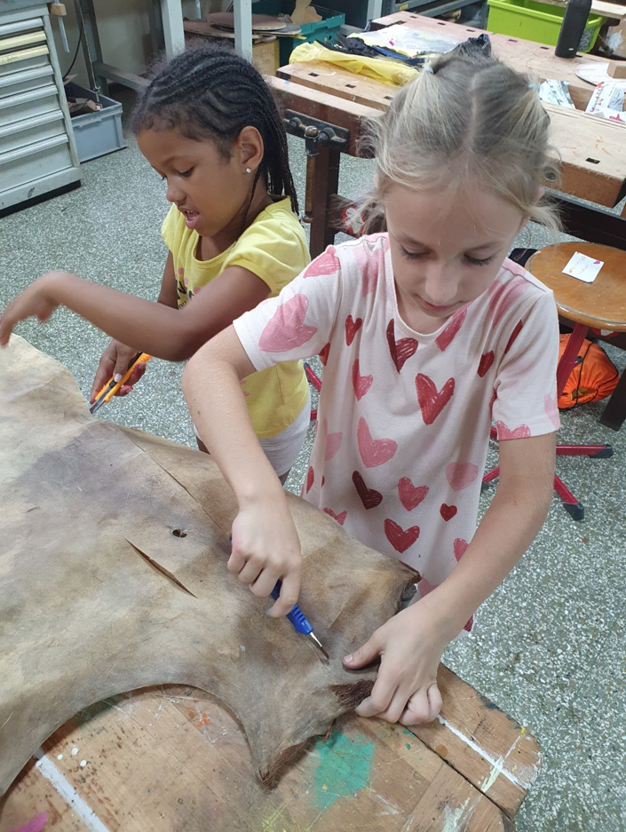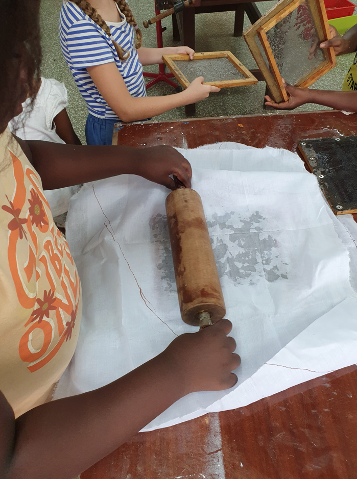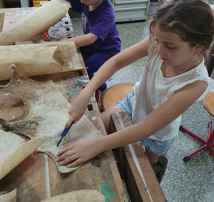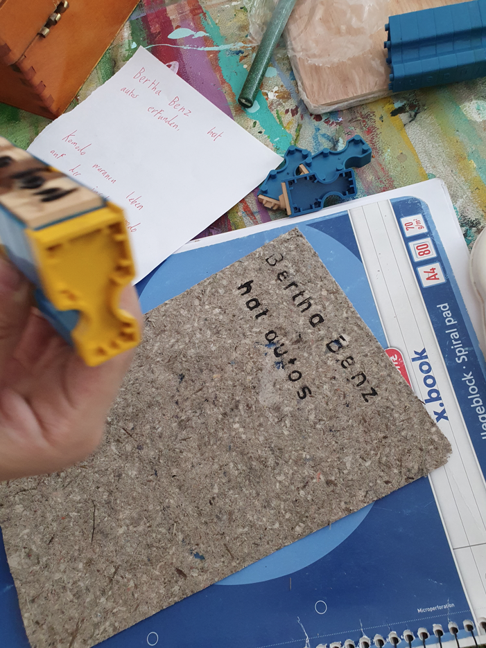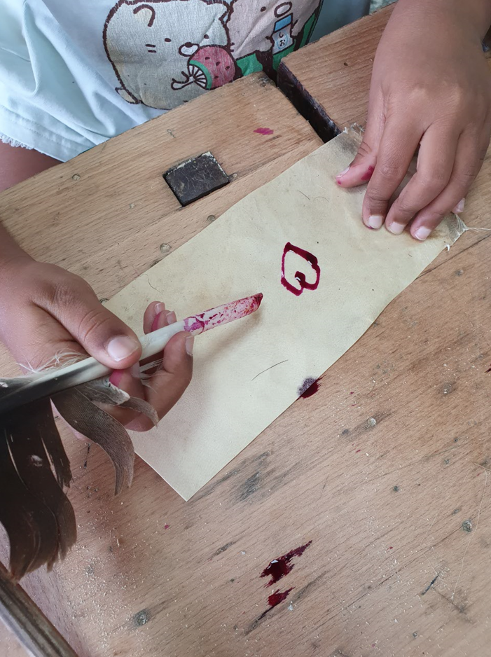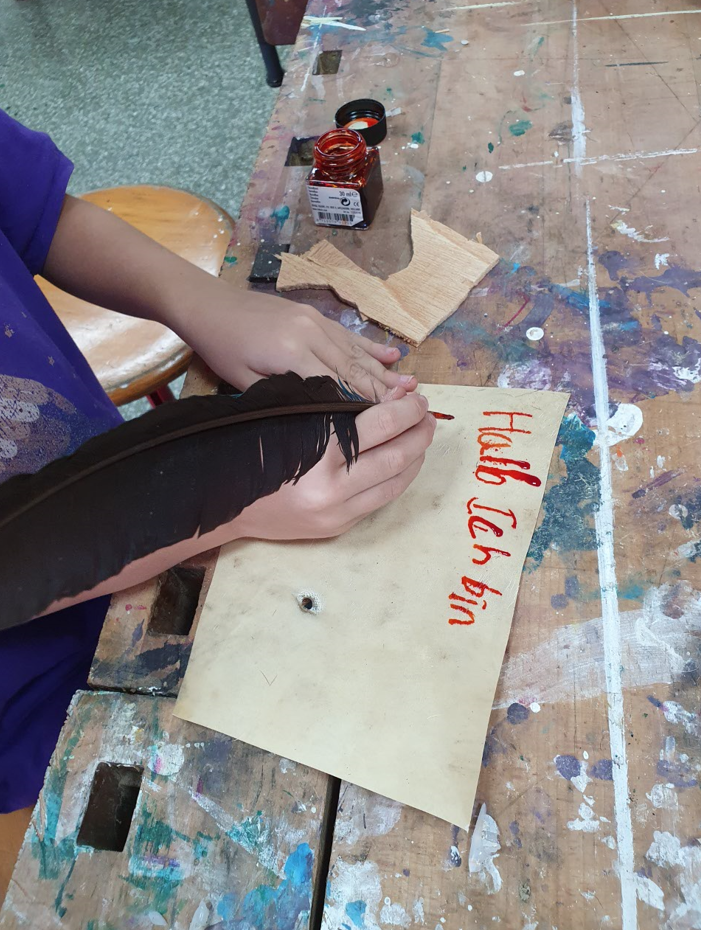 Im Projekt Papier-Druck haben wir uns die Wespennester (erste Papierproduzenten) angeguckt und die letzten Papierblätter geschöpft. Während die letzten Papierbögen trockneten, haben wir uns dem Pergament als Schriftträger zugewandt. Die Kinder konnten dabei eine Schafshaut zerteilen, was ihnen sichtlich Freude bereitete. Auf den kleinen Pergamentstückchen kamen danach erneut die Schreibfedern zum Einsatz. Im Projekt haben wir die getrockneten Papierblätter von den Stofftüchern abgezogen, gebügelt, zugeschnitten und mit dem Drucken begonnen. Der Versuch eigene Drucklettern zu kreieren scheiterte an der Festigkeit des Linoleums bzw. der Weichheit des Moosgummis. Somit haben wir die vorgefertigten Lettern aus dem Schuldruckset verwendet.