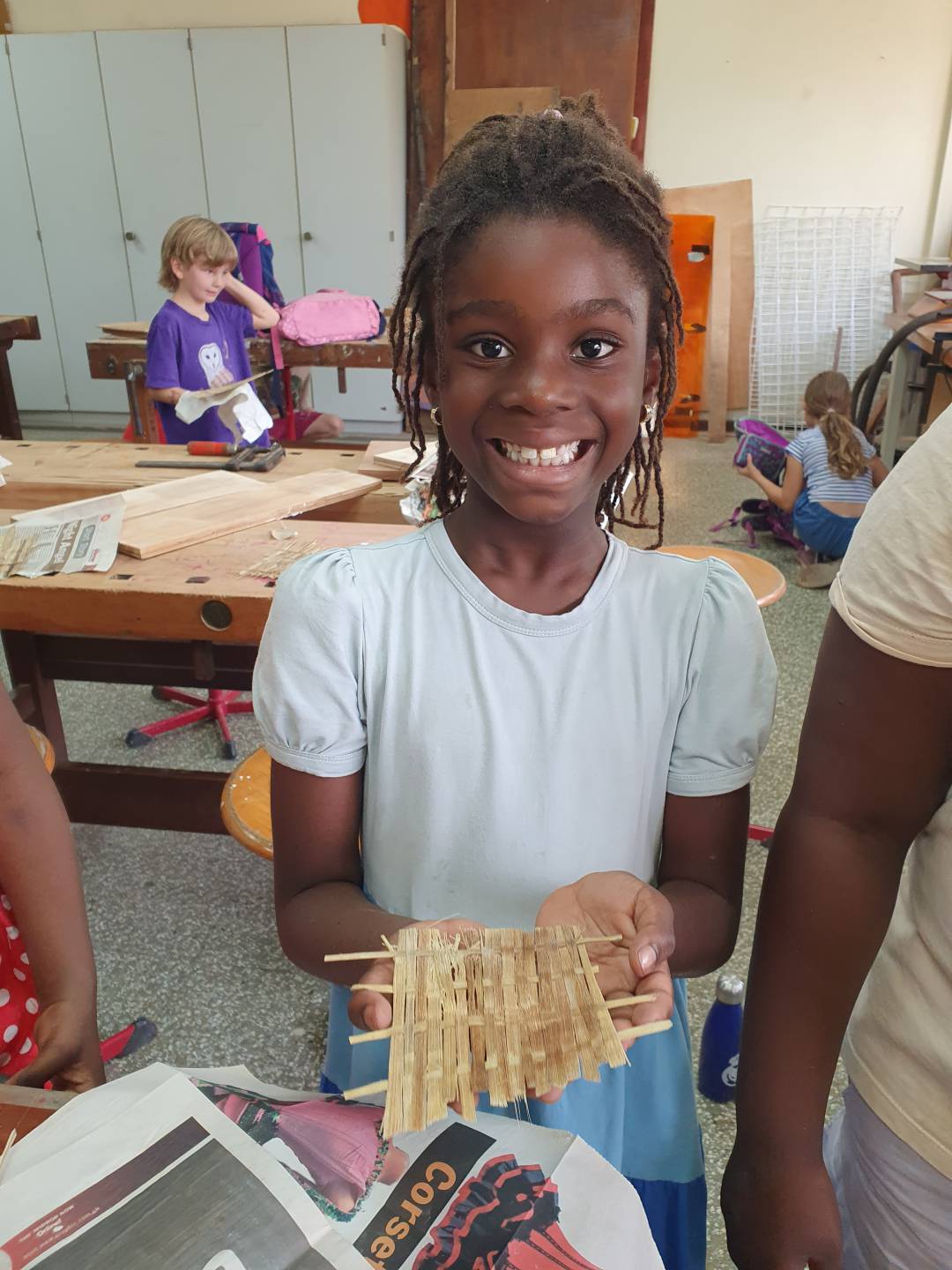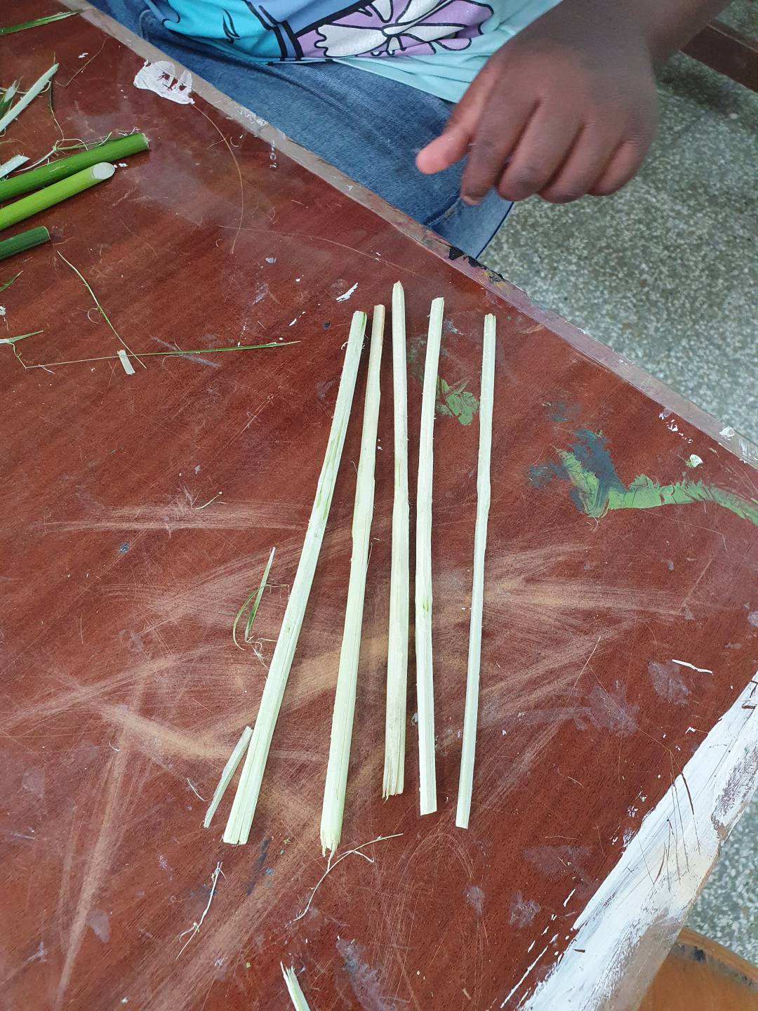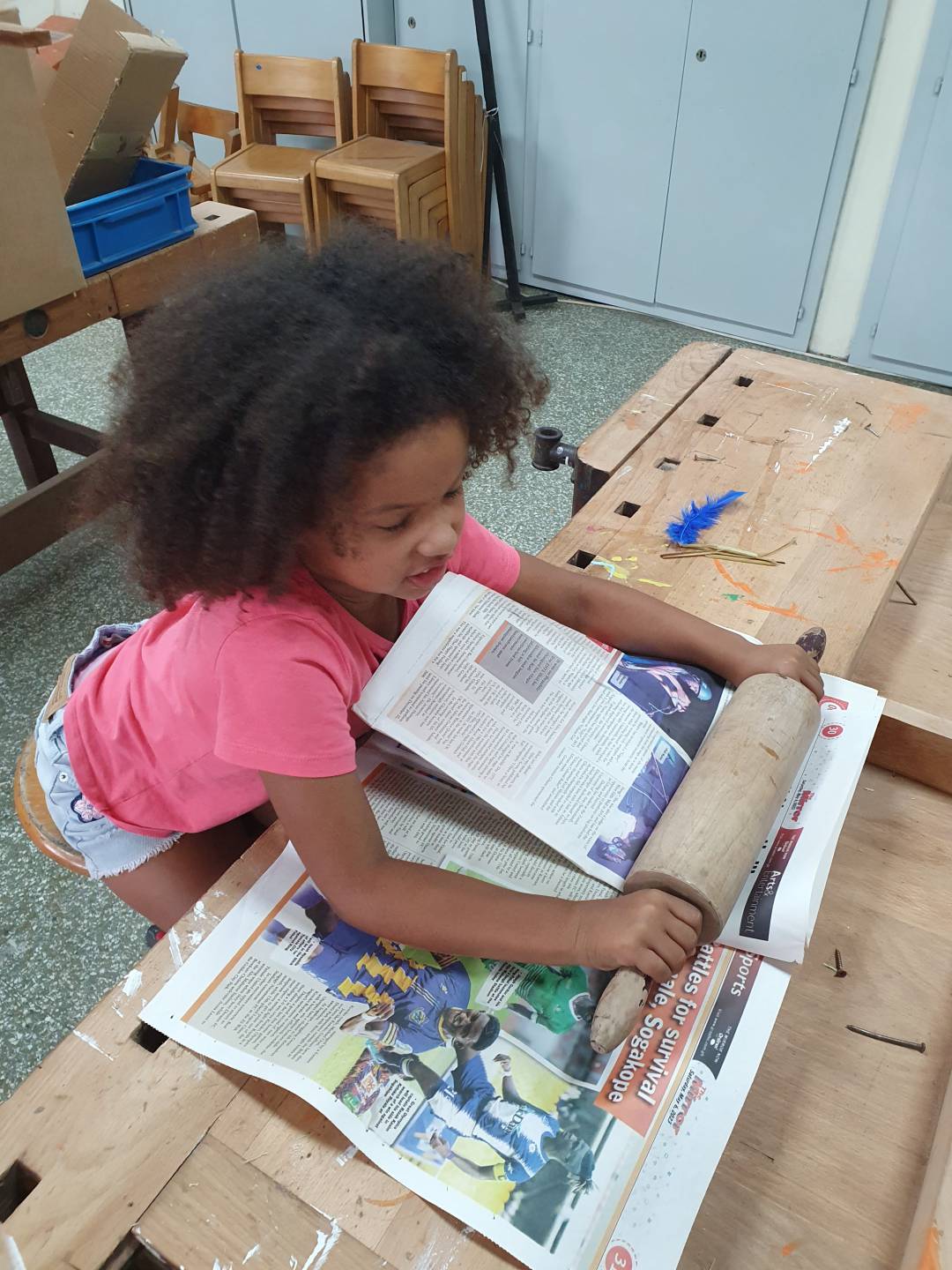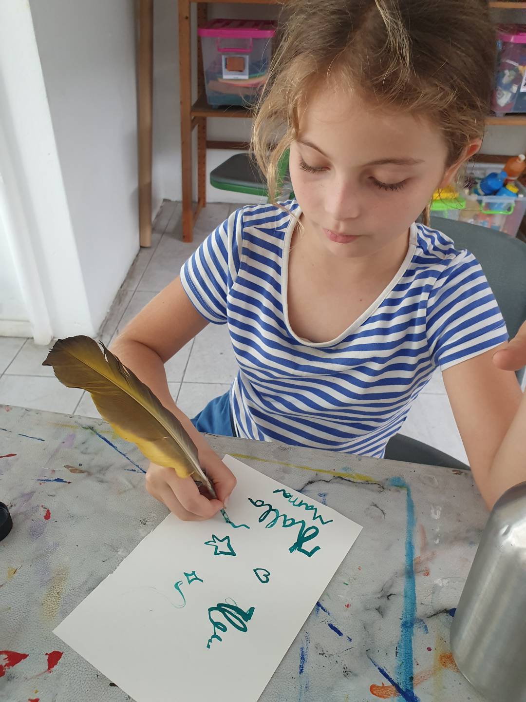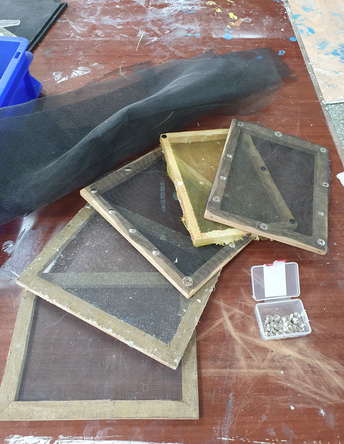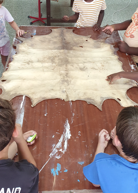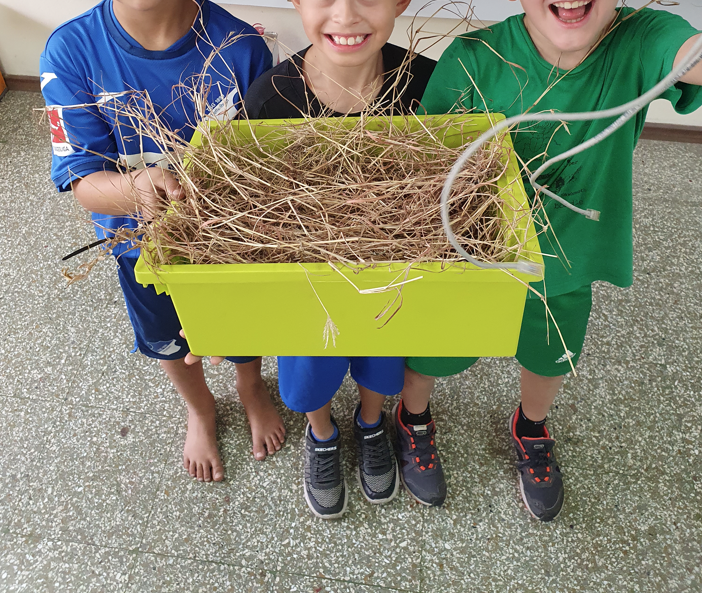 Im Projekt Papier-Druck haben wir uns die Wespennester (erste Papierproduzenten) angeguckt und die letzten Papierblätter geschöpft. Während die letzten Papierbögen trockneten, haben wir uns dem Pergament als Schriftträger zugewandt. Die Kinder konnten dabei eine Schafshaut zerteilen, was ihnen sichtlich Freude bereitete. Auf den kleinen Pergamentstückchen kamen danach erneut die Schreibfedern zum Einsatz. Im Projekt haben wir die getrockneten Papierblätter von den Stofftüchern abgezogen, gebügelt, zugeschnitten und mit dem Drucken begonnen. Der Versuch eigene Drucklettern zu kreieren scheiterte an der Festigkeit des Linoleums bzw. der Weichheit des Moosgummis. Somit haben wir die vorgefertigten Lettern aus dem Schuldruckset verwendet.