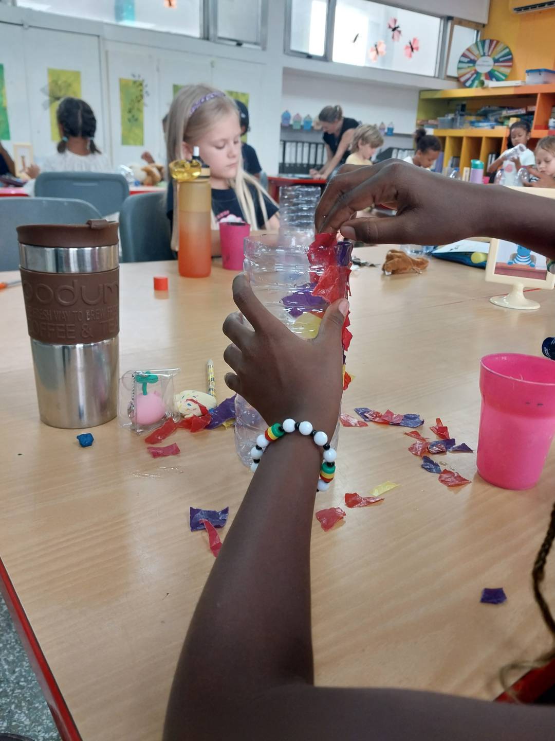 Die Klasse 1/2 hat mit einem kreativen Bastelprojekt einigen Plastikflaschen vom schönen KOSA-Strand ein zweites Leben eingehaucht. Die Schülerinnen und Schüler verwandelten sie mit buntem Papier und Lichtern in farbenfrohe Laternen.