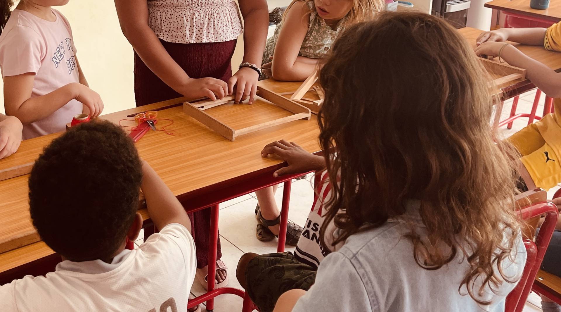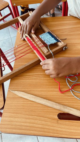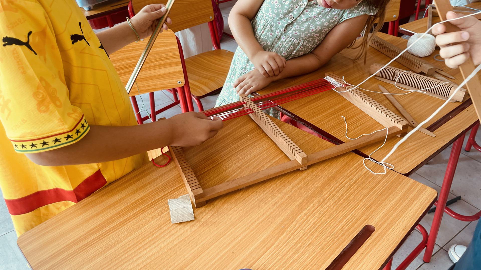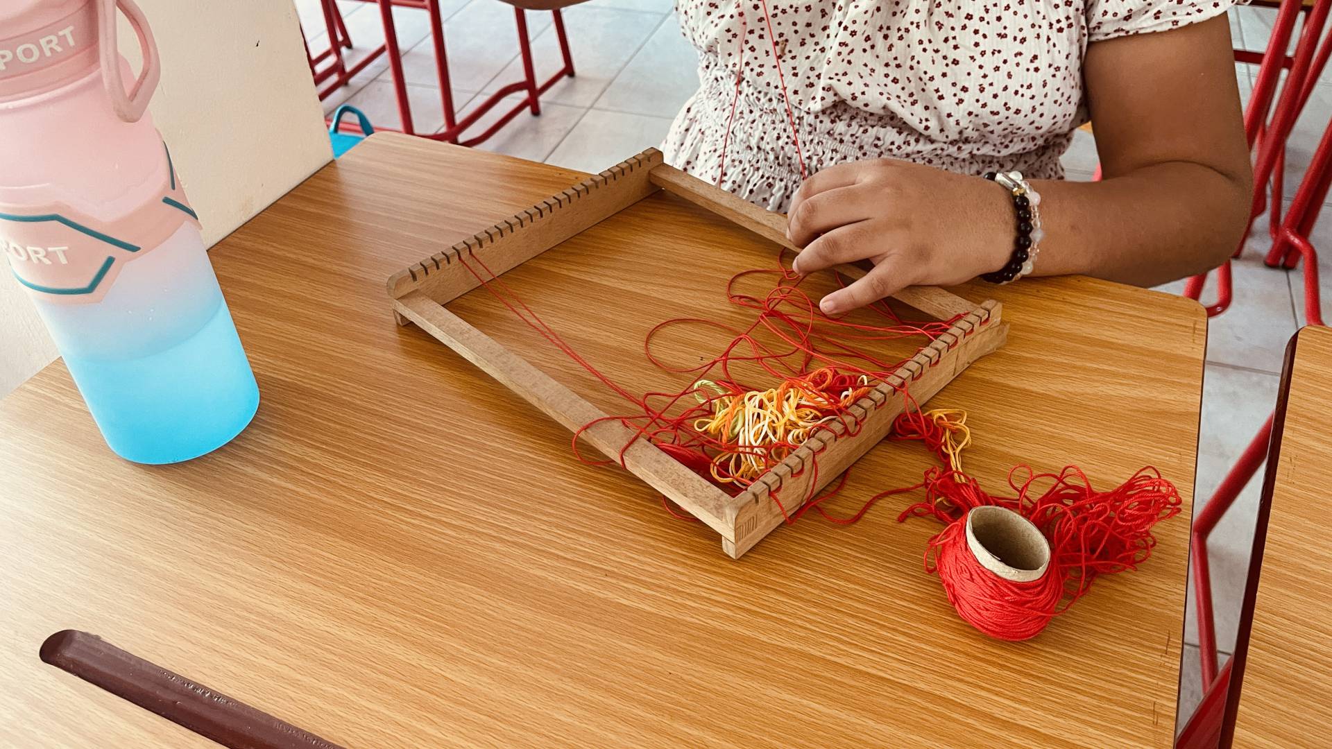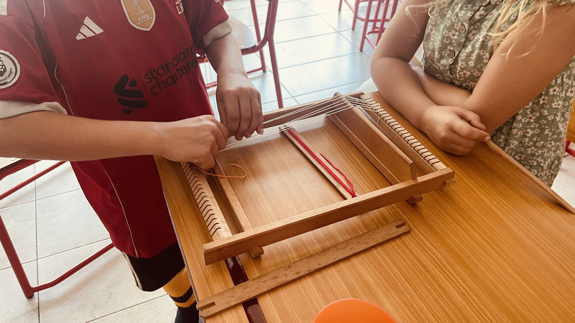 Catherine erklärte den Kindern, dass man die Kettfäden des Webrahmens immer in einer geraden Anzahl einspannen sollte – sonst gerät das Muster leicht durcheinander. Ein Aha-Moment für viele, denn hier wurde sofort klar: Ohne ein bisschen Mathe geht es beim Weben nicht!