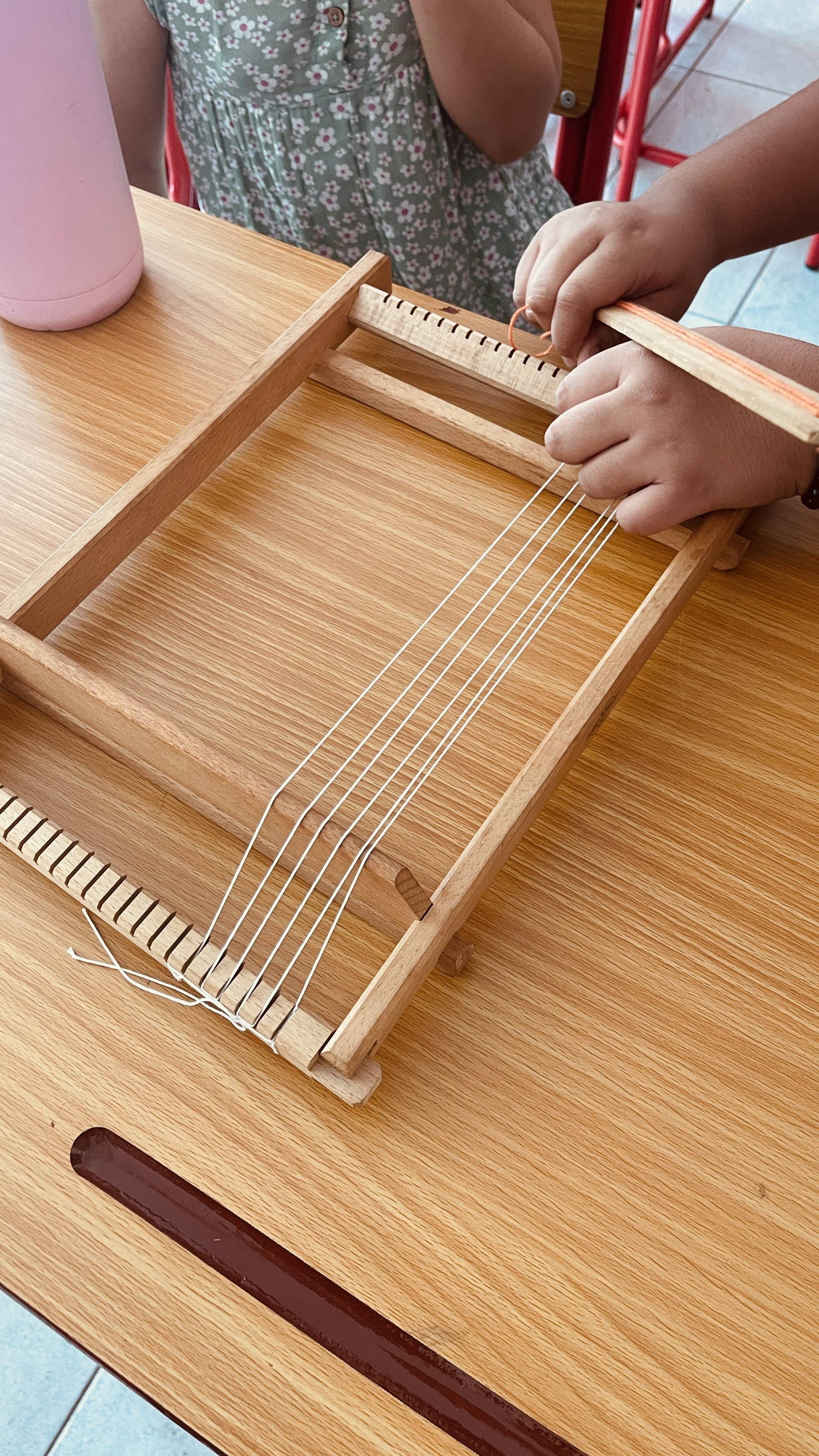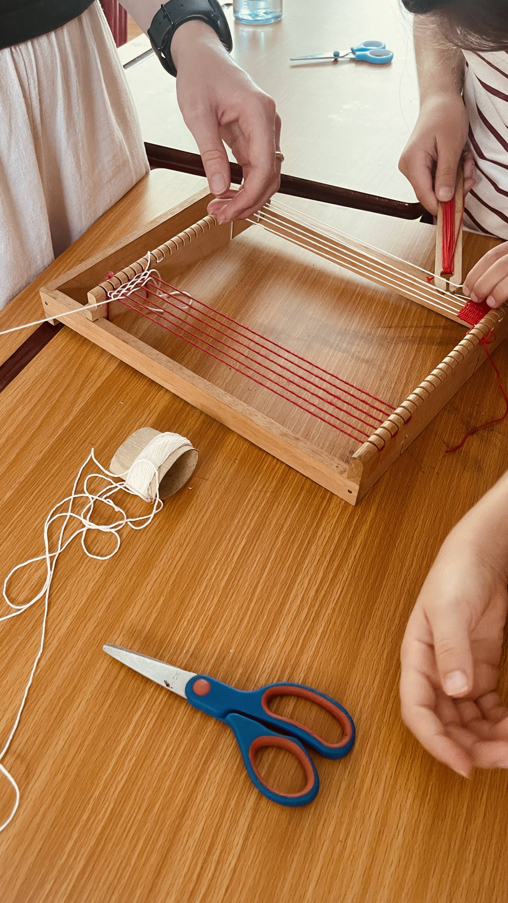 Am Donnerstag ging es kreativ weiter: Eine Gruppe fertigte Mini-Webrahmen aus Pappe an, damit ab nächster Woche jedes Kind eigene Webstücke gestalten kann.