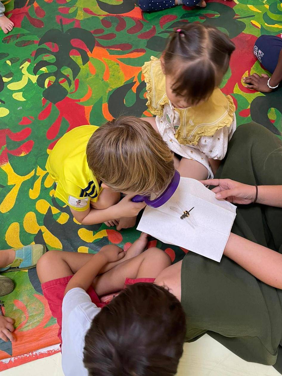 Diese Woche haben wir im Kindergarten eine vertrocknete Libelle gefunden. Die Kinder waren sehr interessiert und so haben wir im uns die Libelle im Morgenkreis direkt mal genauer angeguckt. Mit Hilfe von Lupen konnten die Kinder eine Art Stachel am Körper entdecken und waren ganz begeistert von den feinen, durchsichtigen Flügeln auf denen viele dünne Linien zu erkennen waren.