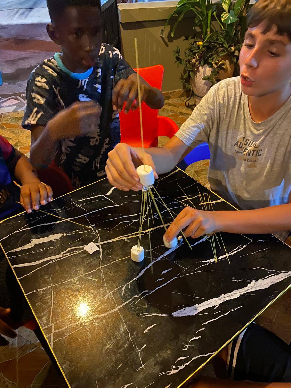 Am Abend fand dann noch eine besondere Challenge statt: der Spaghetti-Tower-Wettbewerb! Jedes Team bekam drei Marshmallows und zwanzig Spaghetti-Stäbchen – und das Team von Zoe, Nii, Baba und Jaiden gewann (mit ein wenig Hilfe von Miss Mayoga) mit dem höchsten Turm.