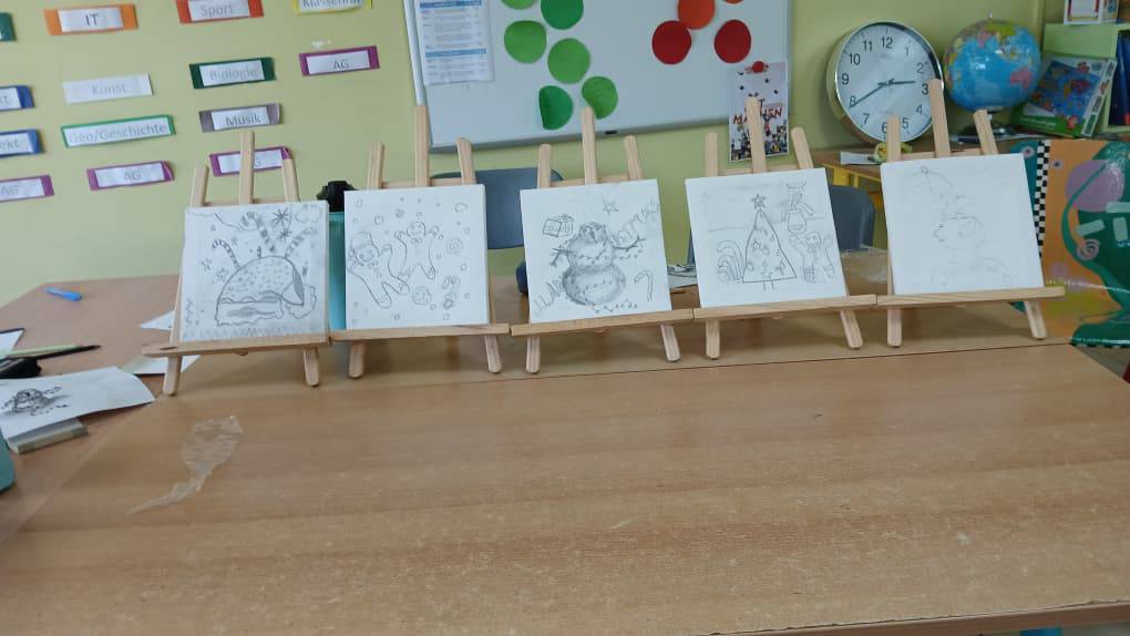 In diesem Projekt lag echte Weihnachtsfreude in der Luft: Unsere Schülerinnen und Schüler konnten ihre Kreativität frei entfalten und ihrer Fantasie mit Pinsel und Farbe Ausdruck verleihen. Aus weißen Leinwänden entstanden farbenfrohe, festliche Kunstwerke, die im wahrsten Sinne des Wortes leuchten und die Vorfreude auf die Feiertage widerspiegeln.