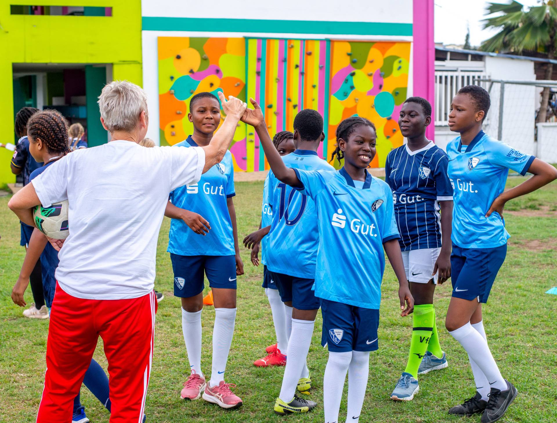 Am Mittwoch, den 9. Oktober 2024, fand an der DISA eine ganztägige Veranstaltung im Rahmen der „German Days“ der AHK statt. Dies in Kooperation mit der Sparkassenstiftung und „Faces of football e.V.“. Die ehemalige deutsche Fußballnationalspielerin Petra Landers hat sich mit ihrem sozialen Projekt der Förderung des Mädchenfußballs in Afrika verschrieben: Insgesamt nahmen 30 Mädchen im Alter von 7-12 Jahren an dem Workshop teil. Fußball trifft Finanzwelt - die Sparkassenstiftung unterstützt dieses Projekt und ihre Mitarbeiter informierten und inspirierten zum Thema Geld/Sparen/etc. Neben einigen Schülerinnen und Schülern unserer Schule haben auch Vertreter unserer Partner-NGO Universal Wonderful Street Academy und unserer benachbarten Schule in Nima, den Youngsters, teilgenommen.