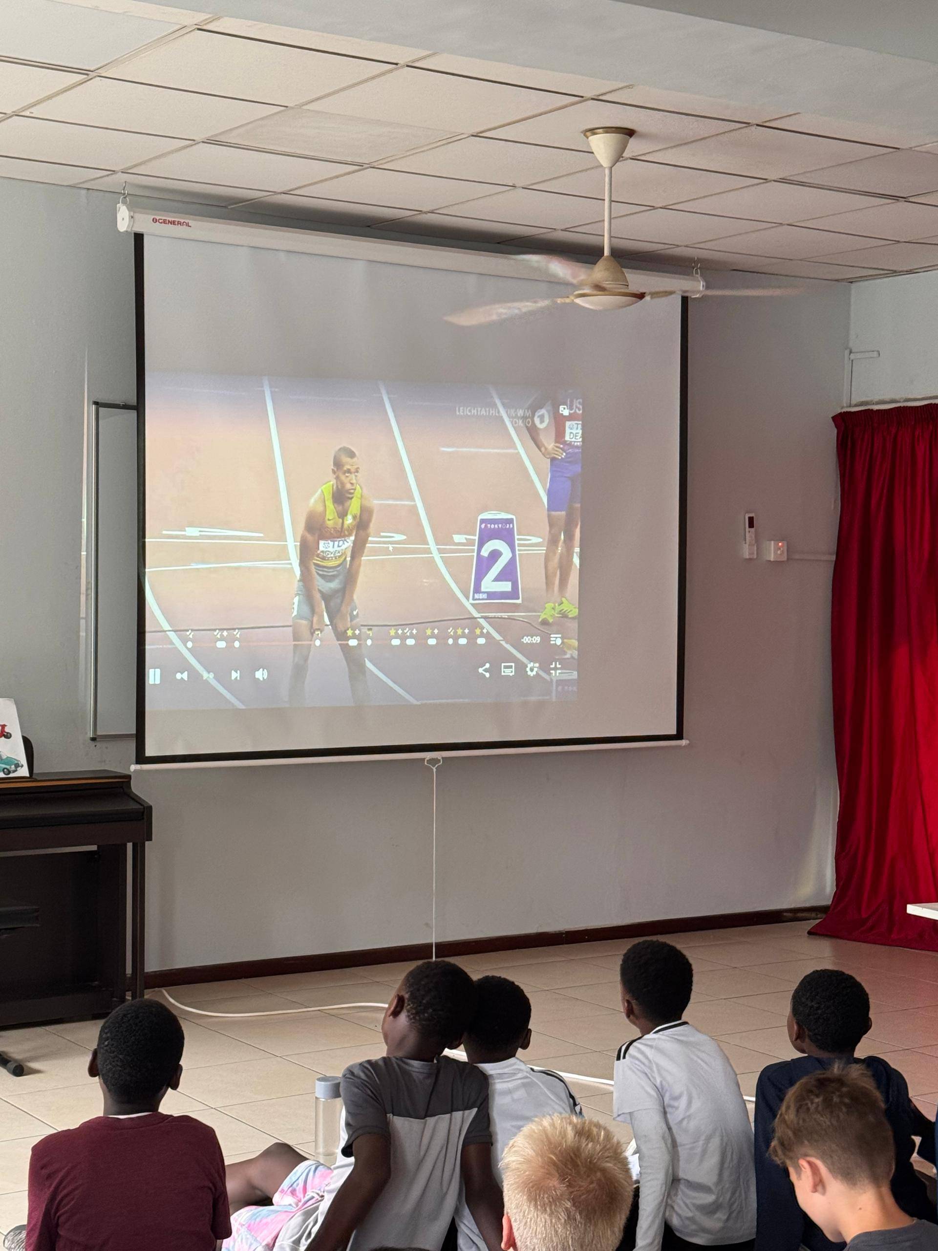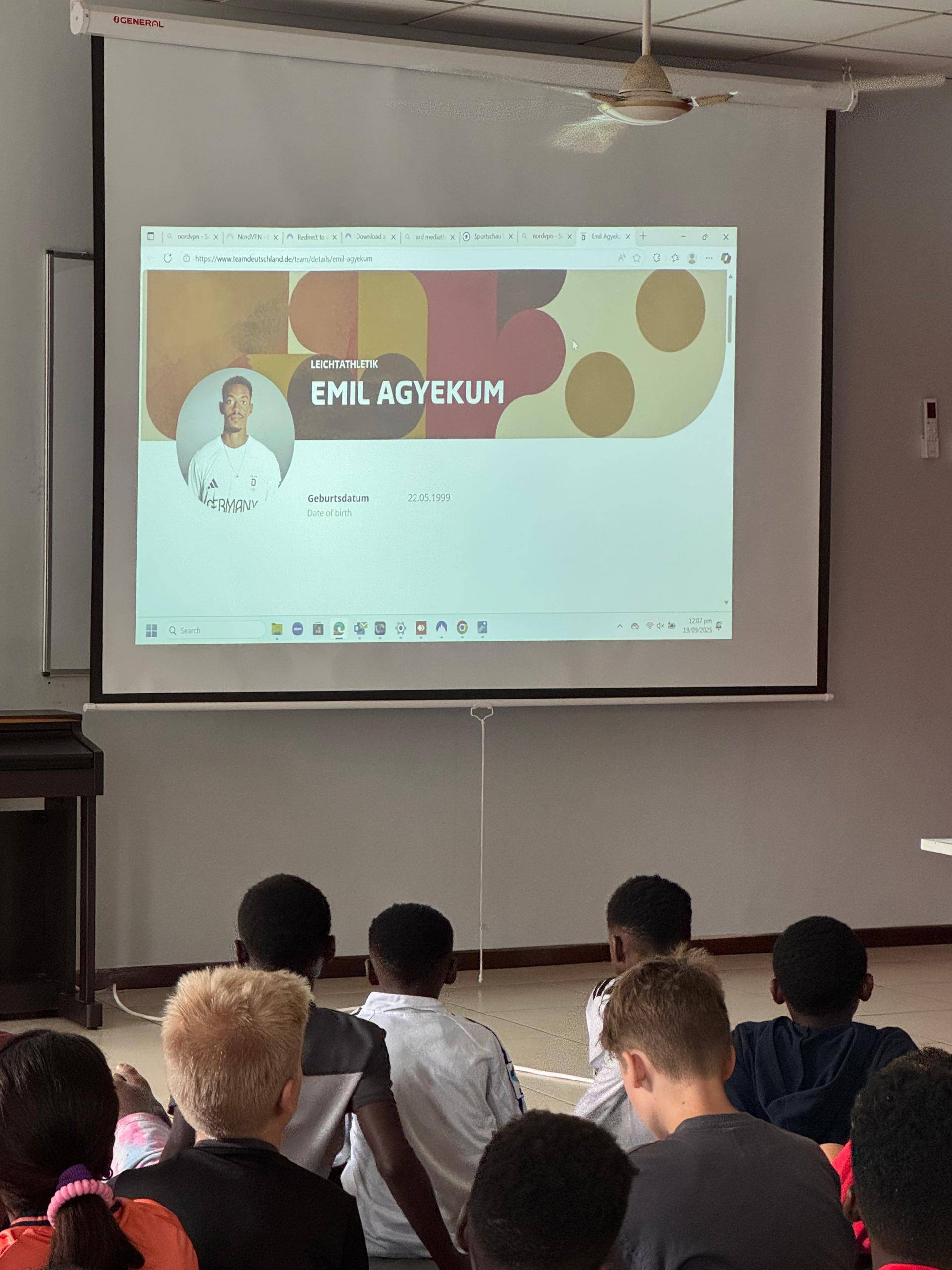 Gestern herrschte in unserer Schulgemeinschaft große Aufregung: Die Klassen 5–8 versammelten sich, um gemeinsam unseren ehemaligen Schüler Emil Nana Kwame Agyekum im Finale über 400 Meter Hürden anzufeuern. Mit selbstgemalten Plakaten, lautstarken Anfeuerungsrufen und jeder Menge Begeisterung verwandelten unsere Schülerinnen und Schüler das gemeinsame Schauen in ein echtes Sportevent.