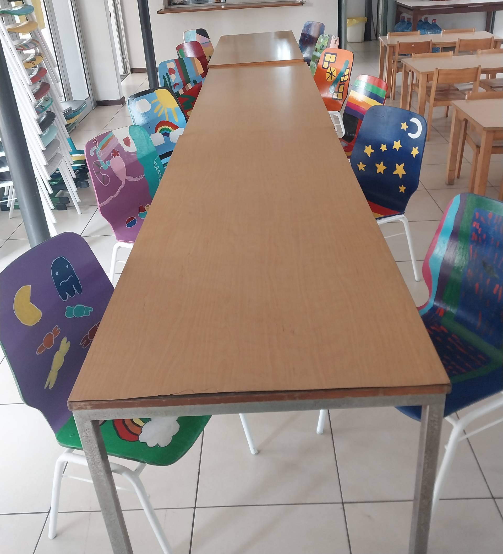 Über 70 Stühle stehen uns, zusätzlich zu den Stühlen in den Klassen und Gruppen, in der Schule für Events und die Bestuhlung unserer Mensa zur Verfügung. Stühle, die noch bis vor kurzem etwas in die Jahre gekommen und wenig attraktiv ihr Dasein fristeten. Eine spannende und in unseren Augen äußerst erfolgreiche Verschönerungsaktion lässt diese Stühle derzeit in neuem Glanz erstrahlen. Die Kinder der Klassen 1 bis 6 dürfen jeweils bis zu zwei Stühle nach ihren Vorstellungen gestalten. Dafür steht uns Irina tatkräftig und mit einer großen Auswahl hochwertiger Farbe zur Verfügung. Auch in dieser Woche wurden wieder 9 Stühle in kleine Kunstwerke verwandelt. Wir sind stolz auf unsere Schüler und Schülerinnen, aber auch über die Veränderung die durch die neuen Stühle in unserer Mensa eingezogen ist.