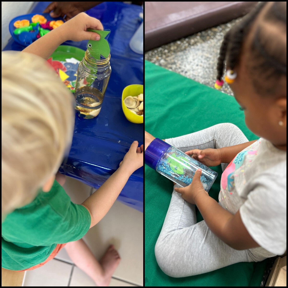 Passend zum Thema Wasser, haben die Kinder in der Krippe Sensorik- Wasserflaschen mit Fischen, Muscheln und Glitzer hergestellt.