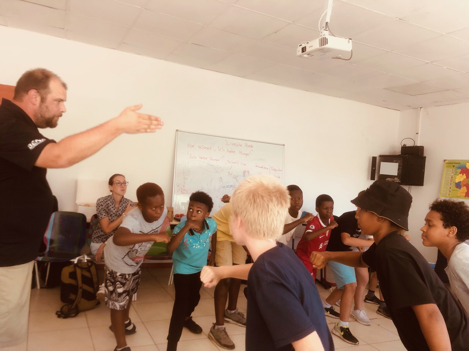 Eine weitere kurze Woche geht zu Ende. In Deutsch haben wir in Klasse 4 weiter an Verben gearbeitet. Klasse 3 hat Rechtschreibung vertieft und unsere Deutschlerner haben besondere Wortschatzarbeit gemacht mit Lernkarten, Wörter buchstabiert und das grammatikalische Geschlecht mit dem Lied "der, die, das" eingeführt. In Mathe haben wir eine Probearbeit geschrieben und jetzt haben wir eine gute Vorstellung wie die Arbeit aussehen wird. In dieser Woche hatten unsere Schülerinnen und Schüler im Fach Englisch viel Spaß dabei, ihre selbst geschriebenen Geschichten vorzustellen! Sie folgten der Struktur einer Geschichte, einschließlich Einleitung, Entwicklung, Problem, Lösung und Ende. Diese gemeinschaftliche Aktivität ermutigte sie, die Kreativität der anderen zu schätzen und ihre Fähigkeiten zum Geschichtenerzählen zu verbessern. Die englische Gruppe mit Laura Lützeler stellte ihre Geschichte ebenfalls fertig und bereitete sich darauf vor, sie nächste Woche der anderen englischen Gruppe vorzustellen. Ermutigen Sie Ihr Kind, seine Geschichte zu Hause mit Ihnen zu besprechen! So langsam wird das Wasser im LaPalmHotel-Pool wieder wärmer und wir konnten mit Freude tauchen und schwimmen. Unsere Spiele in Ethik sind so langsam fertig geworden und nächste Woche werden wir sie alle spielen können und damit weiter unsere Klassengemeinschaft stärken. Am Mittwoch hatten wir einen Workshop zum Thema inklusive Kommunikation - wir haben ein paar Gebärden gelernt, ein interaktives Stein-Schere-Papier gespielt und ein Märchen gehört und dazu in Teams zusammengearbeitet. Das war eine tolle Abwechslung. Heute war unsere letzte Projektzeit vor den German Days morgen. Außerdem haben wir die Generalprobe durchgeführt und sind jetzt schon aufgeregt unsere Ergebnisse aus der Projektzeit morgen euch allen zu präsentieren.