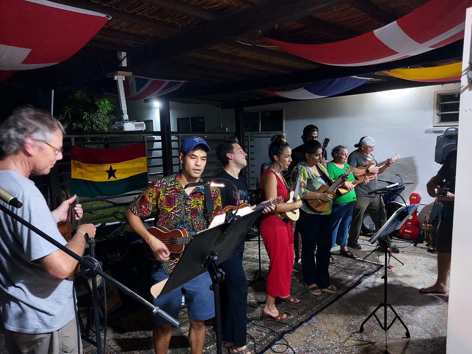 Was für ein schöner Abend, ein Konzert im schuleigenen Wohnzimmer! So in etwa fühlte sich der Auftritt der "Ukes of Hazard" und "O'Brolenkpe" am gestrigen Donnerstag, 05.12.24 an. Die „Selbstverzwergung“ der Band mit "wenig Talent" konnte das Publikum nicht bestätigen und bei dem einen oder anderen Klassiker auch mit Mitsingen honorieren. Gegen 22 Uhr reisten die letzten Gäste ab und hinterließen einen bleibenden Eindruck. Gerne werden wir ihnen nächstes Jahr erneut die Bühne bieten. Die Deutsche Schule Accra nimmt die Rolle als Kulturmittler also auch in einer neuen, weiteren Facette wahr. Gerne würden wir auch anderen Künstlern eine Bühne bieten. Sprechen Sie uns an!