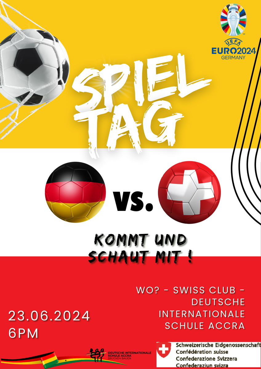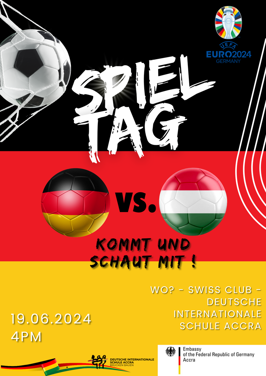 Gleich zweimal möchten wir gerne mit der ganzen Schulgemeinschaft Fußball schauen und Deutschland bzw. die Lieblingsmannschaft anfeuern. Am Mittwoch, 19.06.2024 um 16 Uhr gegen Ungarn und am Sonntag, 23.06.2024 um 18 Uhr gegen die Schweiz, jeweils im Swiss Club. Save the date - wir werden für beide Public Viewings zeitnah eine Abfrage machen, da die Plätze begrenzt sein werden und wir jeweils auch mit der Ungarischen und Schweizerischen Botschaft co-hosten. Stimmung also garantiert, auch wird es landestypische Snacks und Getränke geben.