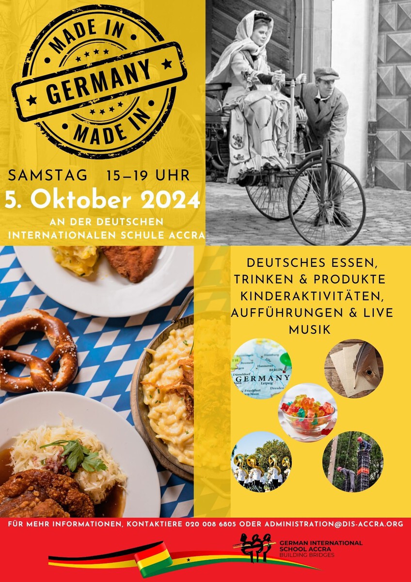 Am 5.10.2024 nehmen wir wieder an den German Days, die durch die AHK in Accra organisiert werden, teil. Dieses Jahr lautet unser Motto "Made in Germany". Neben leckerem deutschem Essen, stellen die Kinder auch Produkte vor, die sie in der Projektzeit vorbereitet haben. Für den Spaß der Kinder ist durch Mitmachaktionen, die durch die Schülerinnen, Schüler, Lehrerinnen und Lehrer sowie durch die Ghana Mountaineers durchgeführt werden, gesorgt. Den Abend lassen wir mit einer Brass Band und einem Mix aus deutschen Klassikern sowie Afrobeats ausklingen. Wir freuen uns auf zahlreiche Besucher!