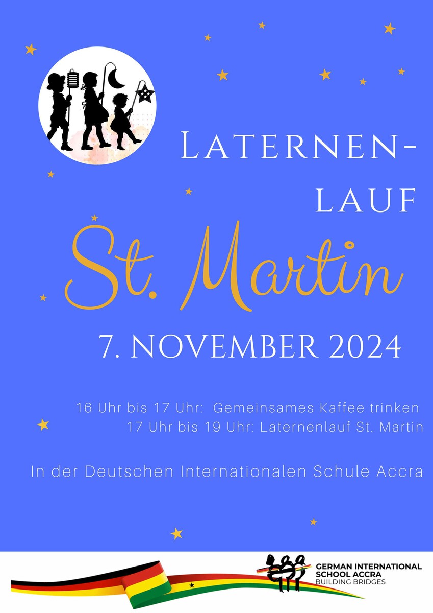 Wir freuen uns, Sie und Ihre Kinder zu unserem St. Martins-Laternenlauf am Donnerstag, dem 7. November 2024, einladen zu können. Die Veranstaltung beginnt mit einem gemütlichen Beisammensein von 16:00 bis 17:00 Uhr, bei dem Sie Kaffee trinken und sich mit anderen Familien austauschen können. Im Anschluss daran findet von 17:00 bis 19:00 Uhr der Laternenlauf statt, bei dem wir die Tradition von St. Martin mit einer wunderschönen Ausstellung von handgefertigten Laternen und einem Spaziergang durch die Schulumgebung feiern. Wir freuen uns darauf, diesen besonderen Abend mit Ihnen und Ihren Kindern zu teilen!