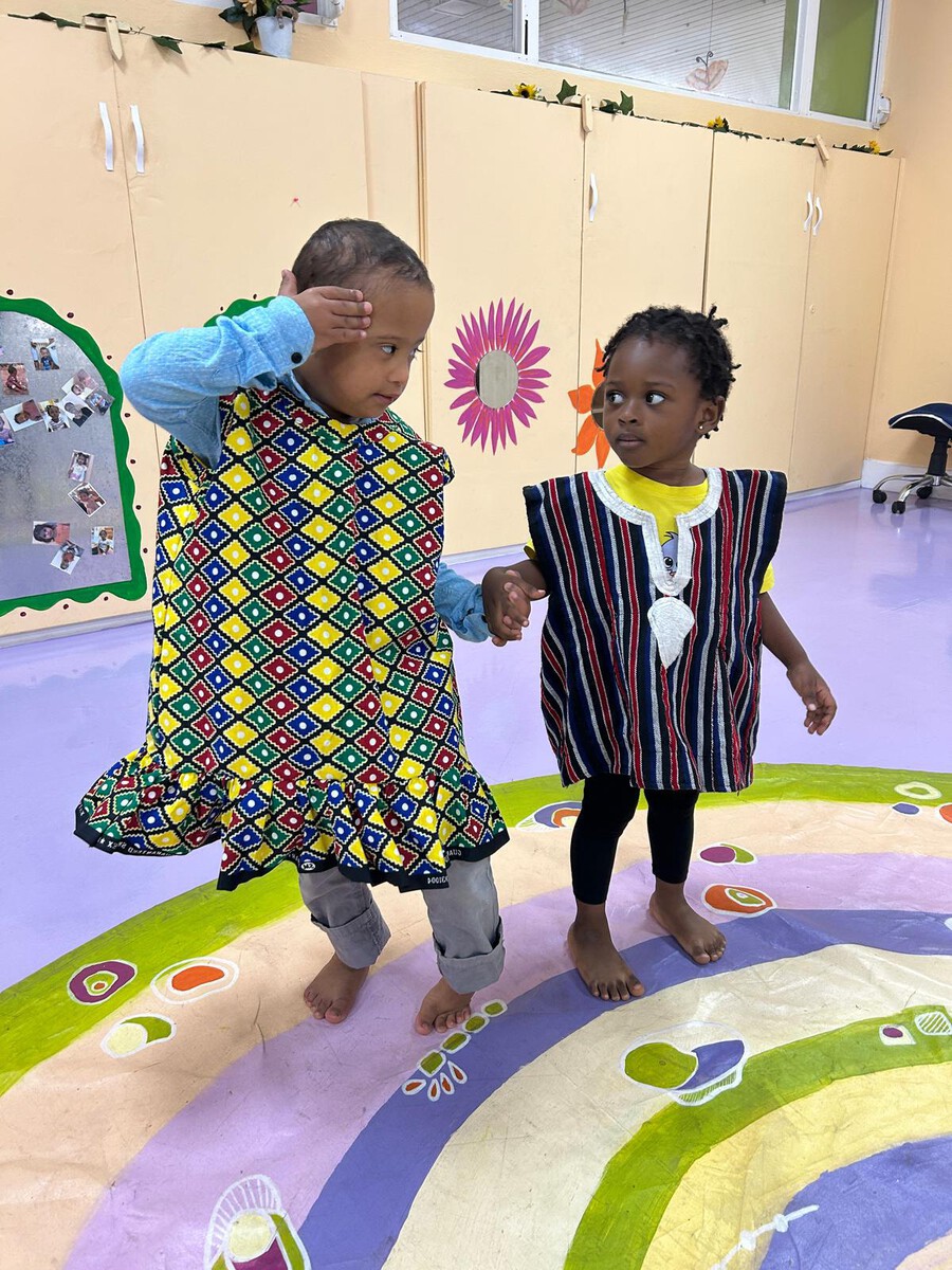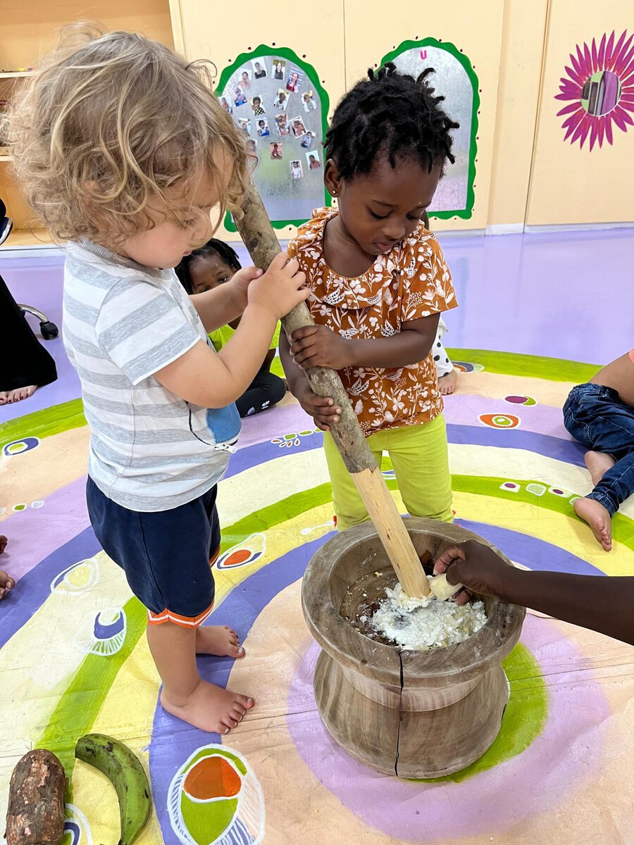 In den vergangenen Tagen haben wir uns in der Kinderkrippe intensiv mit dem Thema Made in Ghana beschäftigt und dabei viele neue Dinge entdeckt. Die Kinder hatten viel Freude daran, die Landkarte Ghanas in den Farben der Landesflagge – Rot, Gelb und Grün – auszumalen. Ein weiteres Highlight war unsere musikalische Reise: Gemeinsam haben wir getrommelt und uns dabei im Rhythmus geübt. Besonders aufregend war das Basteln unserer eigenen Musikinstrumente. Die Kinder durften Rasseln aus Kalabash-Holz mit Mais und Sand befüllen und sie anschließend mit traditionellen Stoffen bekleben. So konnten sie nicht nur kreativ sein, sondern auch erfahren, wie solche Instrumente in Ghana hergestellt werden. Ein besonders spannender Moment war das Stampfen von Fufu, bei dem die Kinder hautnah erleben konnten, wie in Ghana traditionelle Speisen zubereitet werden. Mit viel Begeisterung haben sie mitgemacht und dabei spielerisch gelernt. Am Freitag haben wir gemeinsam Karneval gefeiert! Die Kinder genossen ein leckeres Frühstück und hatten viel Spaß beim Tanzen zu Karnevalsmusik. Die Stimmung war voller Freude, Lachen und vielen bunten Kostümen!