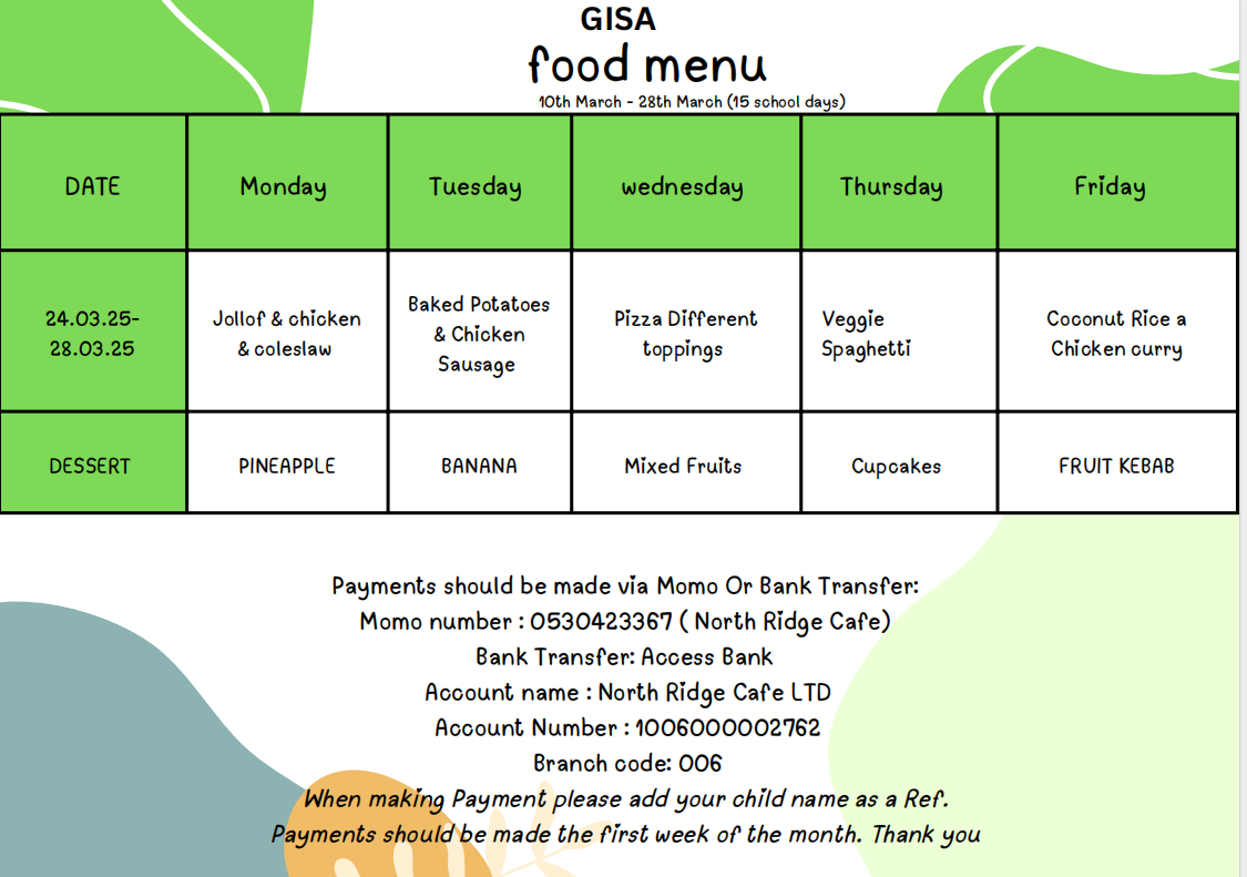 Das North Ridge Café freut sich, sein neues Menü für den Monat März vorzustellen. Ab März wird das North Ridge Café schrittweise auf ein bargeldloses Zahlungssystem für Schulmittagessen umstellen, um den Prozess reibungsloser und bequemer zu gestalten.