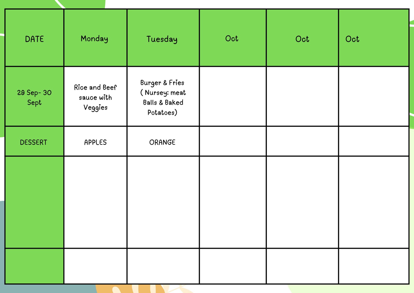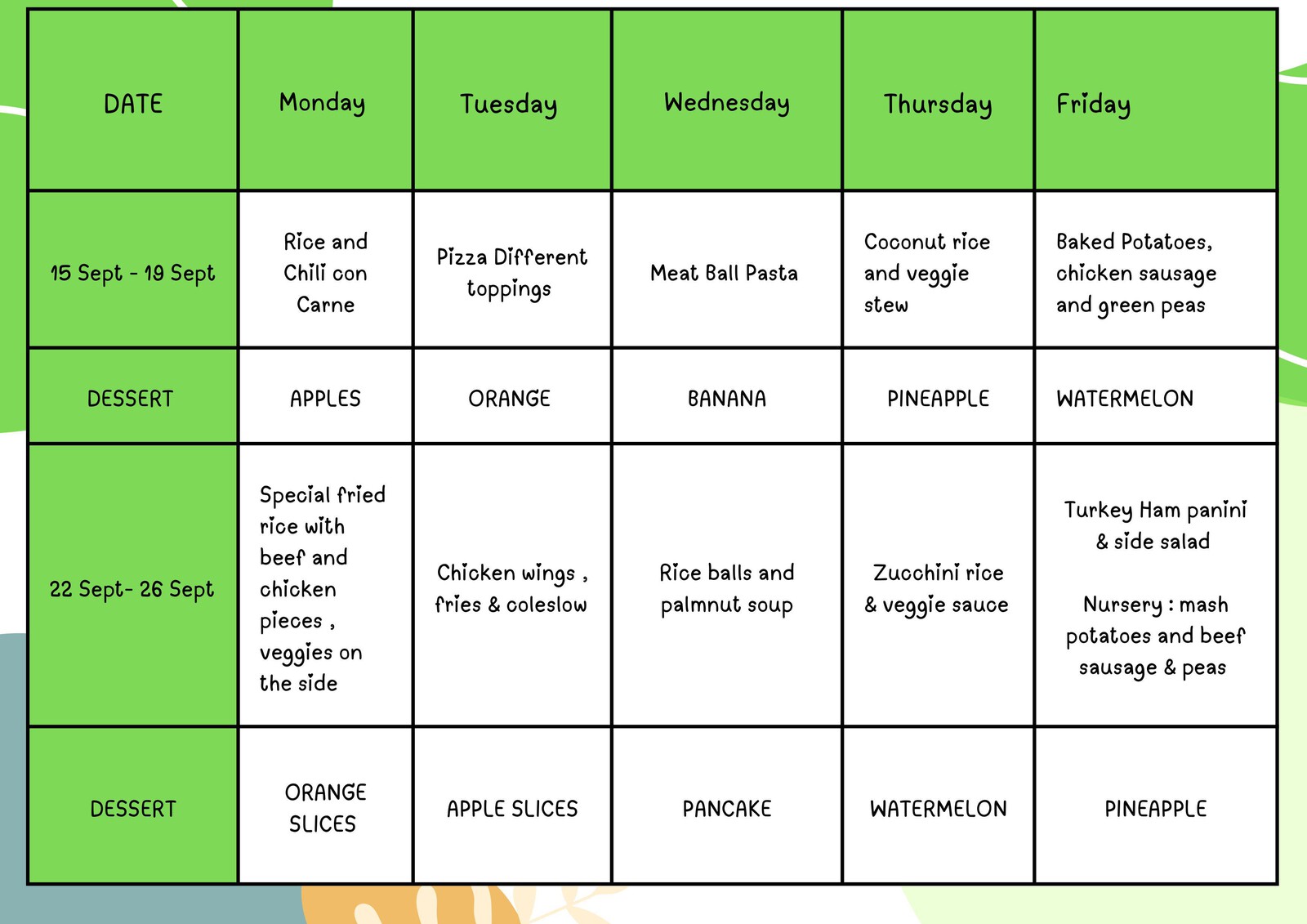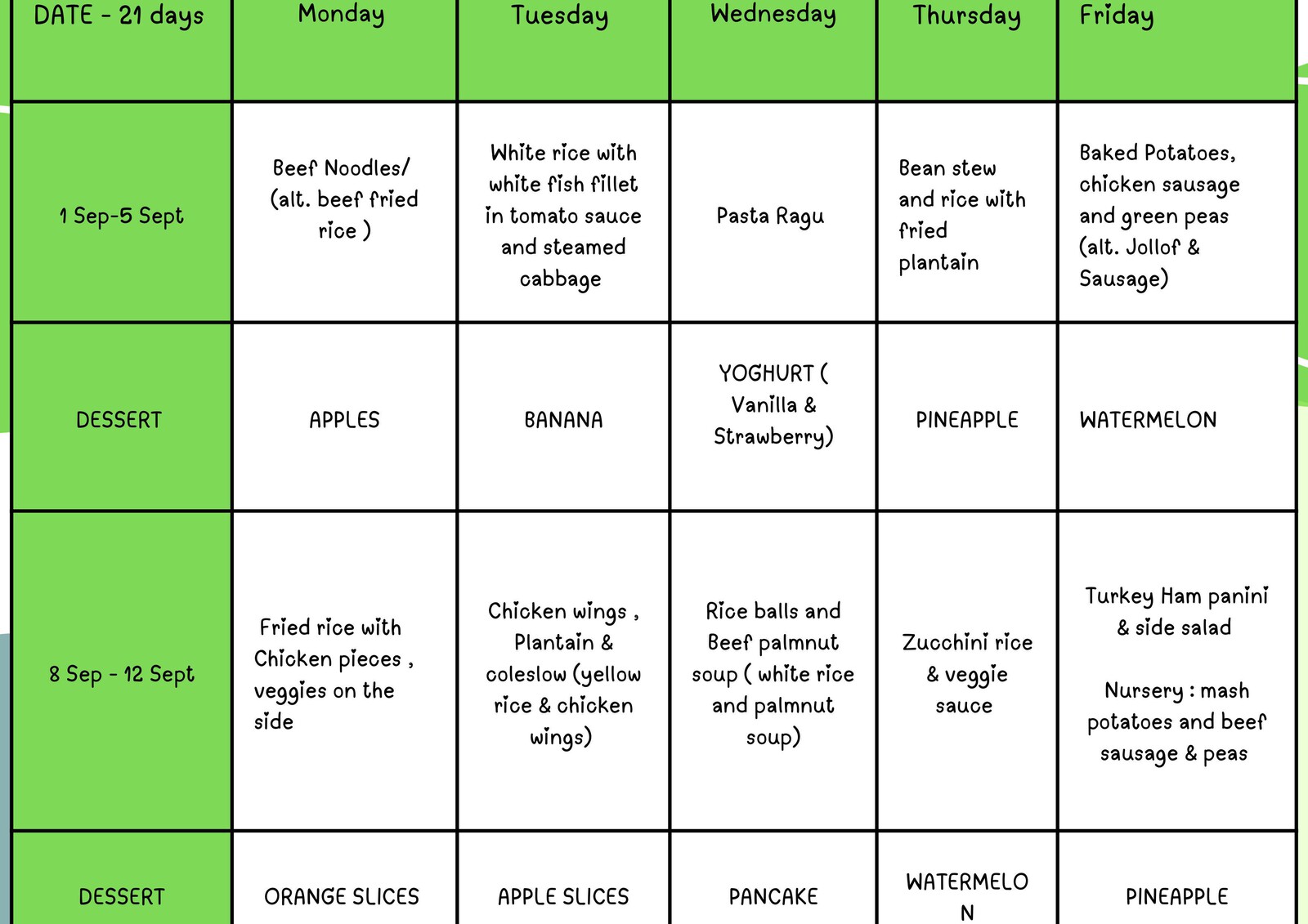 Anbei finden Sie den Speiseplan für den Monat September. Bitte sehen Sie ihn sich in Ruhe an und geben Sie uns gerne Rückmeldung. Teilen Sie Eva außerdem unbedingt mit, falls Ihr Kind Allergien hat.