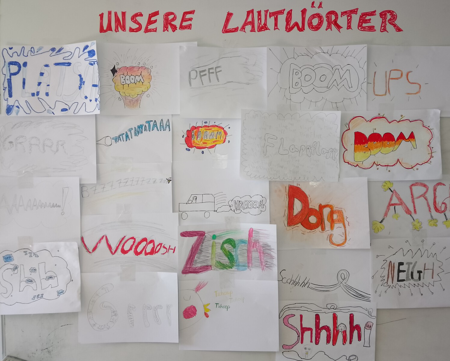 Kreativ ging es auch im Comic-Design-Projekt mit Klasse 5 und 6 zu und wir haben viele bunte und witzige Lautwörter zu Papier gebracht.