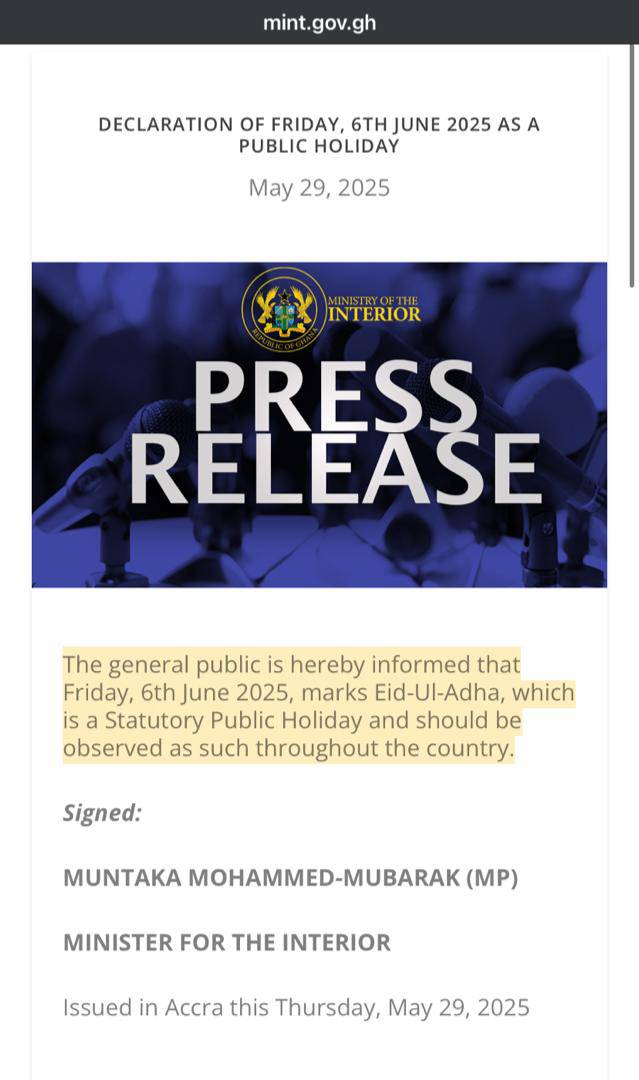 Nun offiziell bestätigt: Am Freitag, den 6. Juni 2025, bleibt die Schule geschlossen, da anlässlich des muslimischen Opferfestes Eid al-Adha ein gesetzlicher Feiertag in Ghana begangen wird.