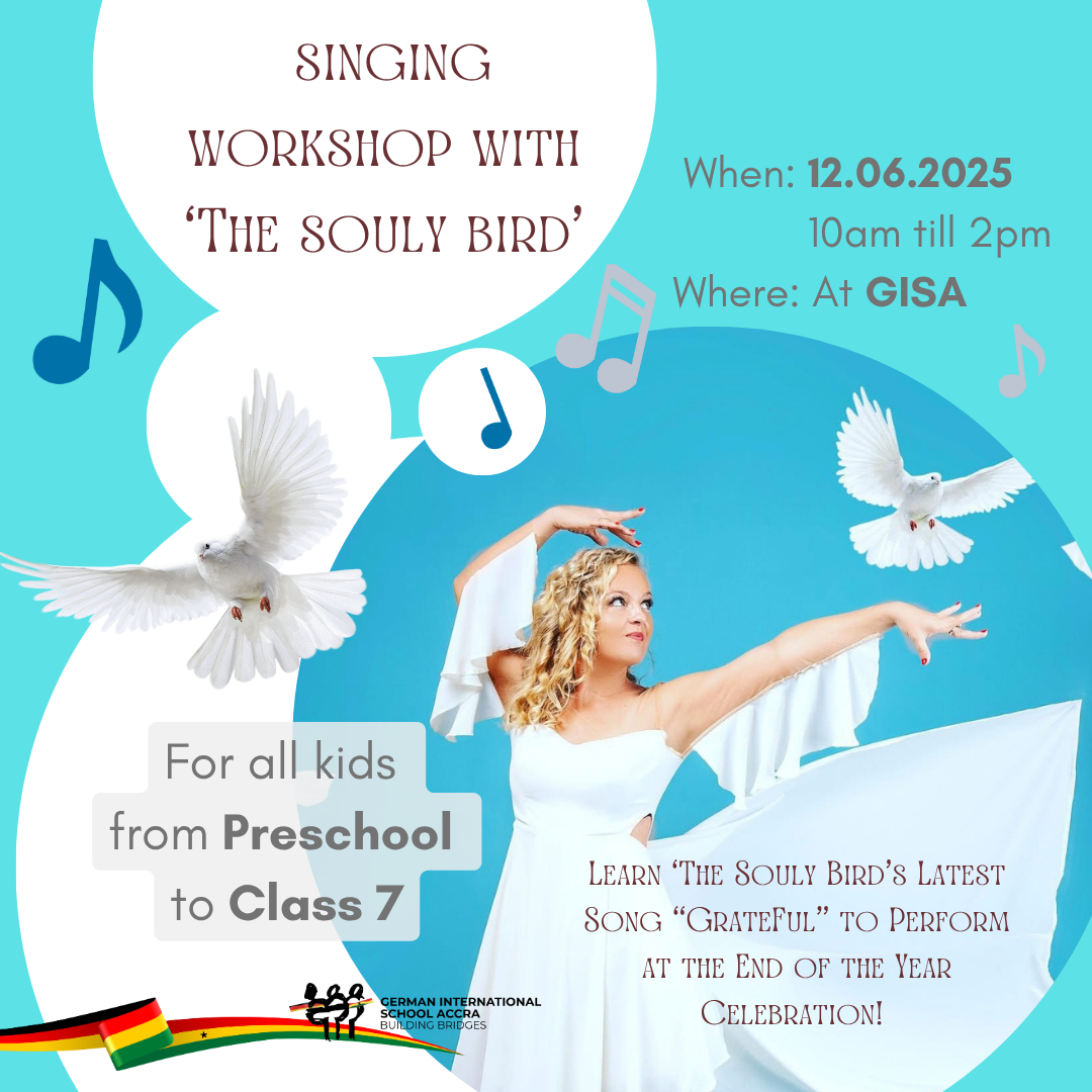 Am Mittwoch, 12. Juni 2025, freuen wir uns auf einen besonderen Musikworkshop mit der Künstlerin ‘The Souly Bird’. Schülerinnen und Schüler von der Vorschule bis Klasse 7 lernen gemeinsam das Lied „Grateful“ und präsentieren es bei der Abschlussfeier. Die Teilnahme erfolgt mit schriftlicher Einverständniserklärung der Eltern. Rückgabe bitte bis spätestens 7. Juni.