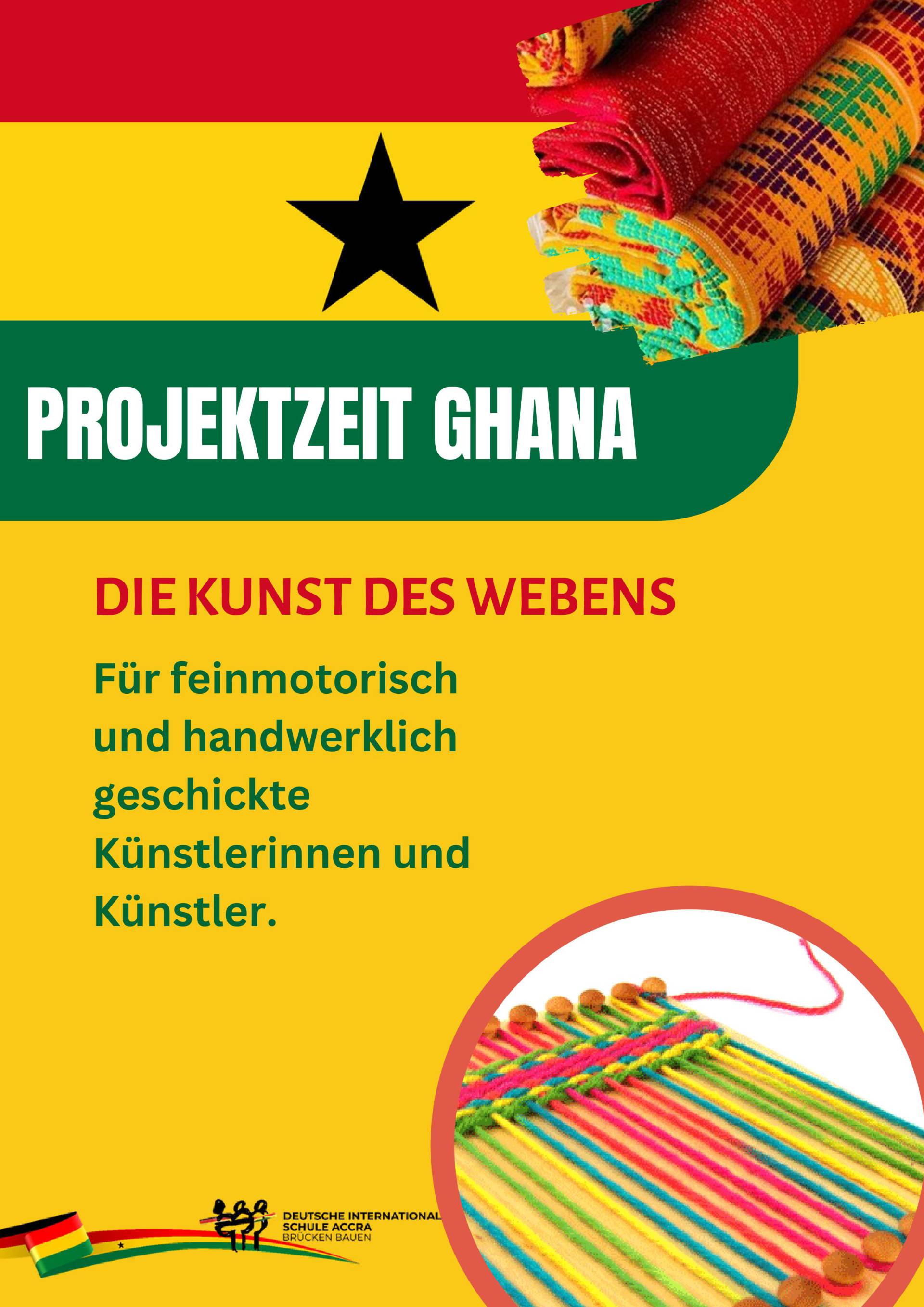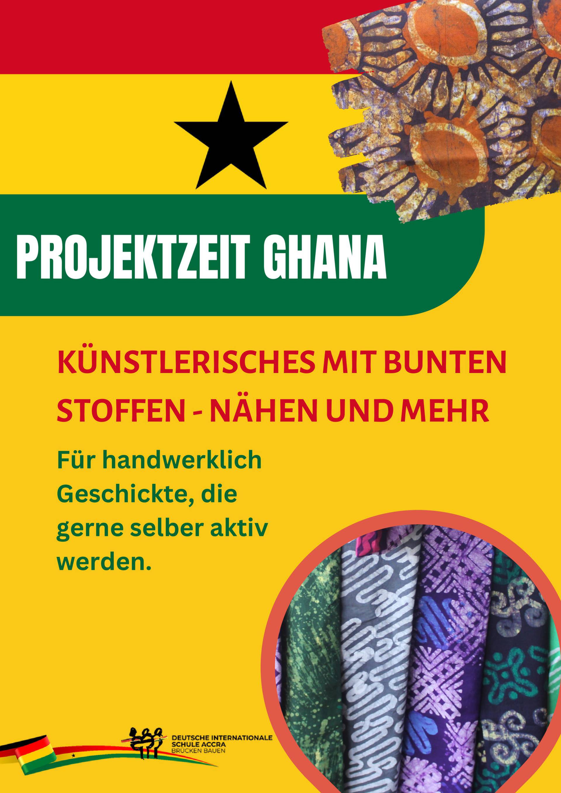 Von einem kreativen Holzworkshop, bei dem die kunstvollen Adinkra-Symbole hergestellt werden sollen, über ein mitreißendes Tanz- und Musikprojekt, das die rhythmische Vielfalt Ghanas zum Leben erweckt, bis hin zu spannenden Einblicken in Sprache und traditionelle Spiele, der Vielfalt sind kaum Grenzen gesetzt. Auch kulinarisch wird es spannend, denn in einem Kochkurs können die Teilnehmenden die köstliche ghanaische Küche kennenlernen. Zusätzlich laden Projekte wie Weben oder Kunst mit Stoff dazu ein, die Handwerkskunst des westafrikanischen Landes selbst auszuprobieren. Bei dieser bunten Auswahl dürfte wirklich für jeden etwas dabei sein!