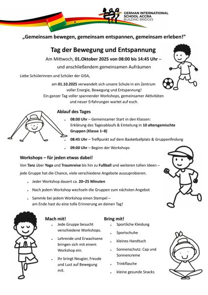 Der gesamte Schultag ist darauf ausgerichtet, Neues auszuprobieren, gemeinsam aktiv zu sein und zugleich Momente der Entspannung zu erleben. Jede Gruppe wird die Möglichkeit haben, alle Angebote kennenzulernen und zu erleben, was Bewegung und Ruhe gleichermaßen für Körper und Geist bedeuten können.