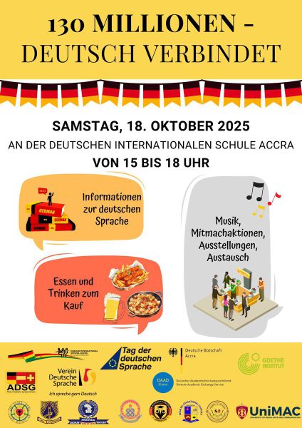 Am Samstag, den 18. Oktober 2025, lädt die German International School Accra herzlich zum Tag der deutschen Sprache ein. Ab 15 Uhr erwartet die Besucherinnen und Besucher ein abwechslungsreiches Programm mit spannenden Mitmachaktionen, inspirierenden Bühnenaufführungen und einem musikalischen Rahmenprogramm, das für beste Stimmung sorgt.