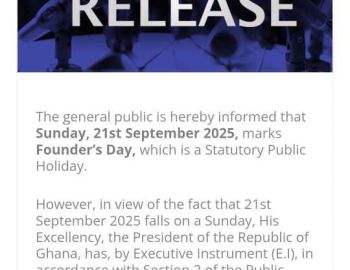 Nach der gestrigen Bestätigung durch eine Pressemitteilung des ghanaischen Innenministeriums wurde Montag, der 22. September 2025, offiziell als Kwame Nkrumah Memorial Day (Founder's Day) festgelegt. An diesem nationalen Feiertag findet kein Unterri…